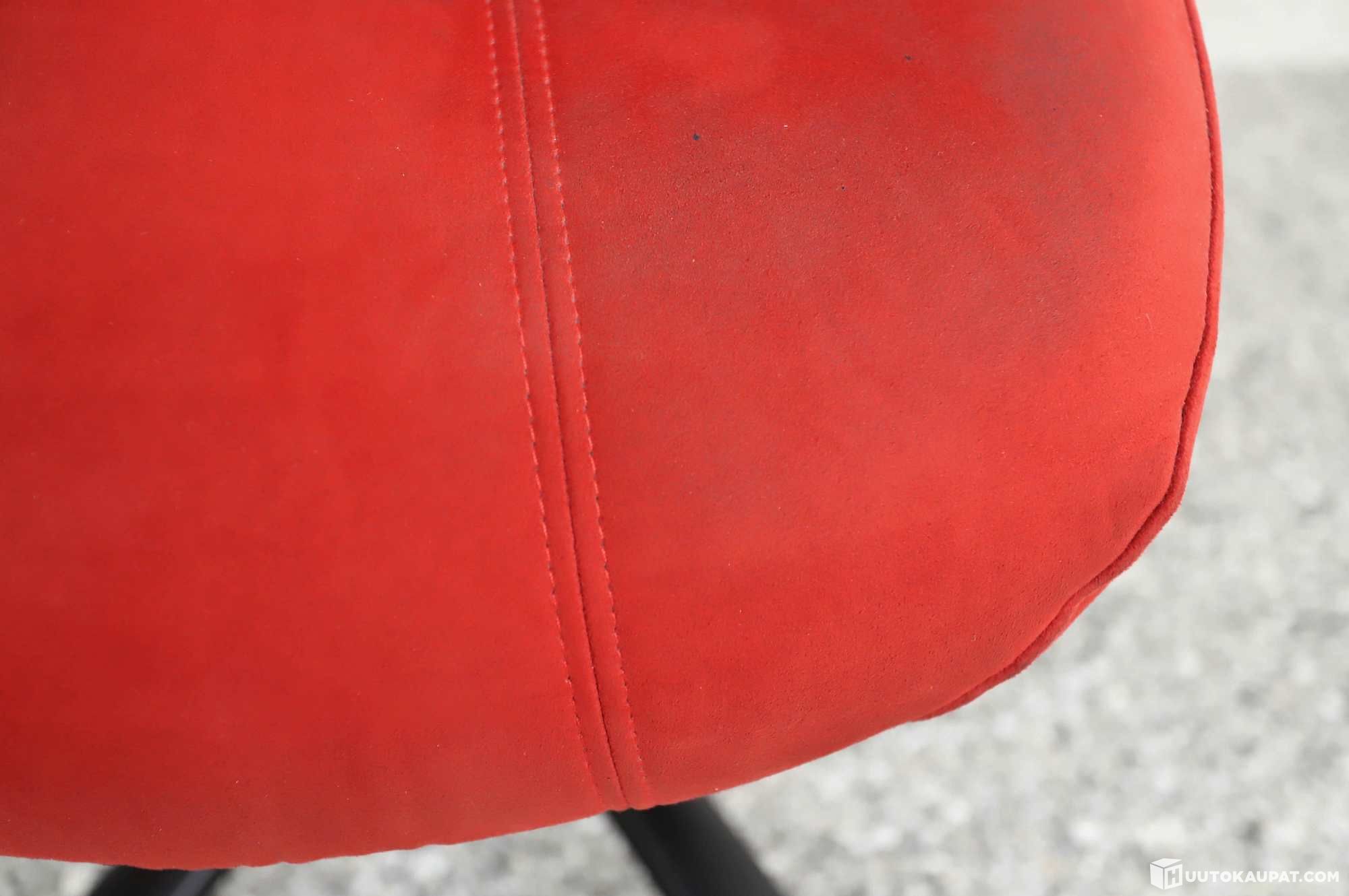 Red, intact upholstery. The upholstery is dirty; one armrest shows wear.