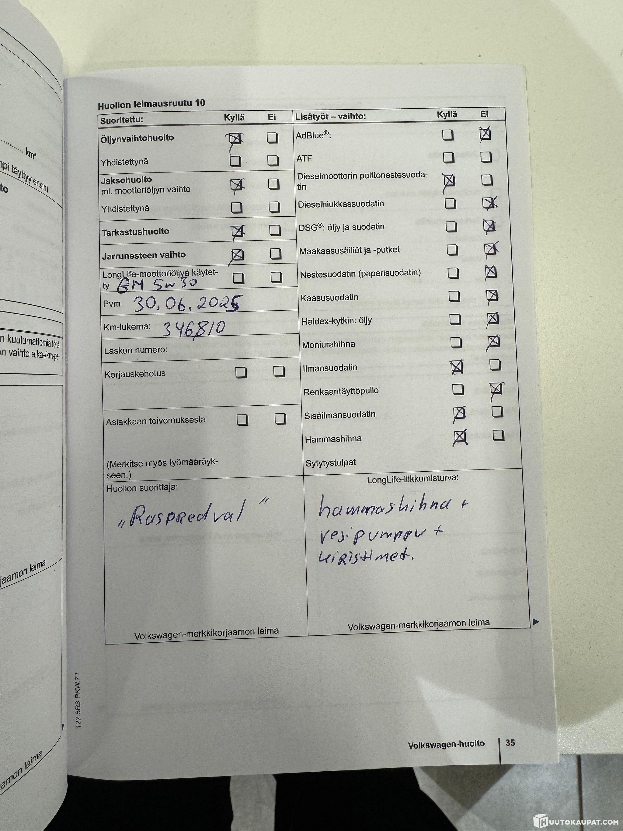 The undercarriage has been checked by the previous owner and all necessary parts have been replaced. Wheel bearing replaced. Footwell repair carried out in summer 2025. Gearbox oil changed at around 320,000 km. New turbo fitted at around 340,000 km.