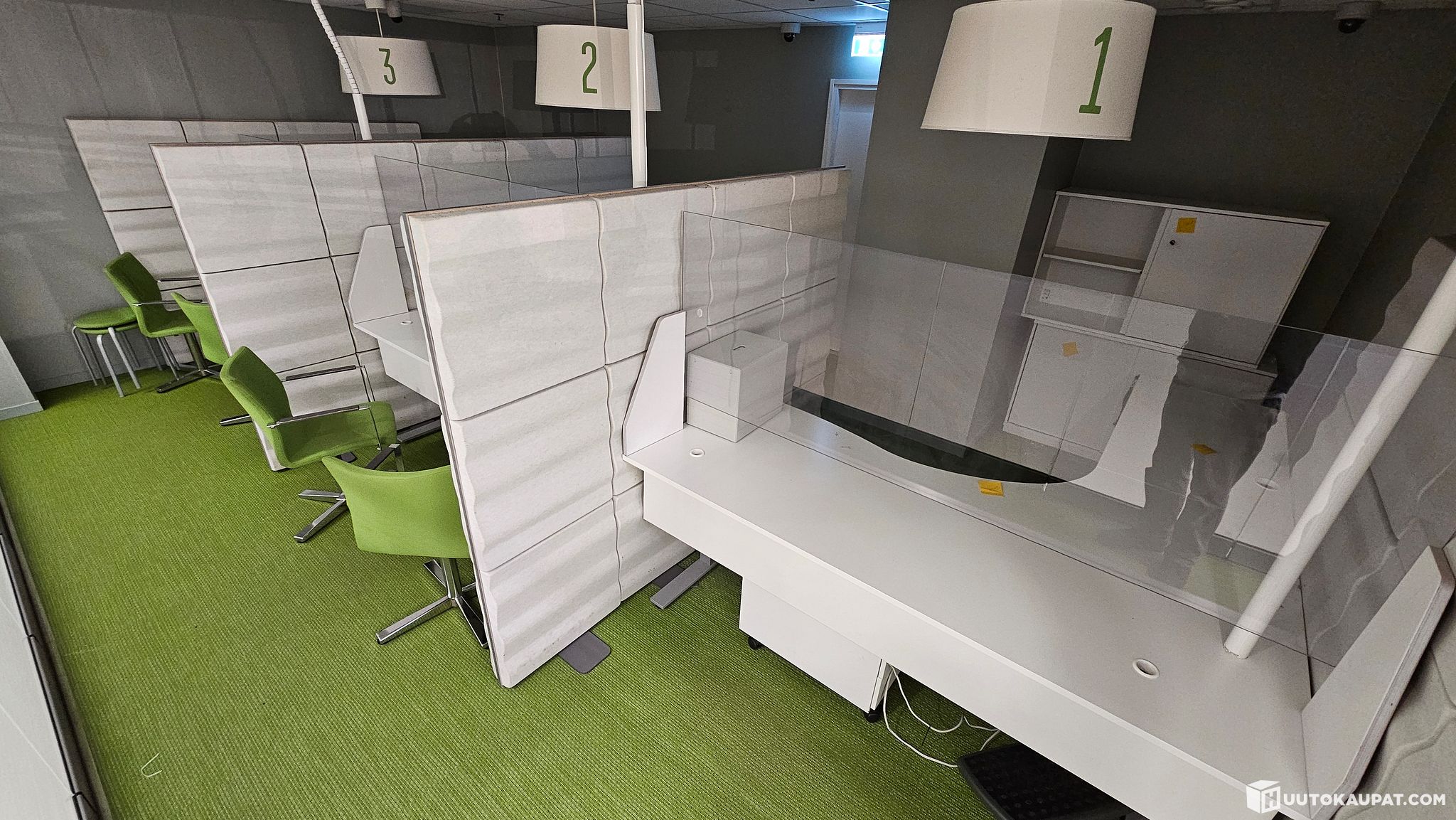 Four (4) green chairs for customers.