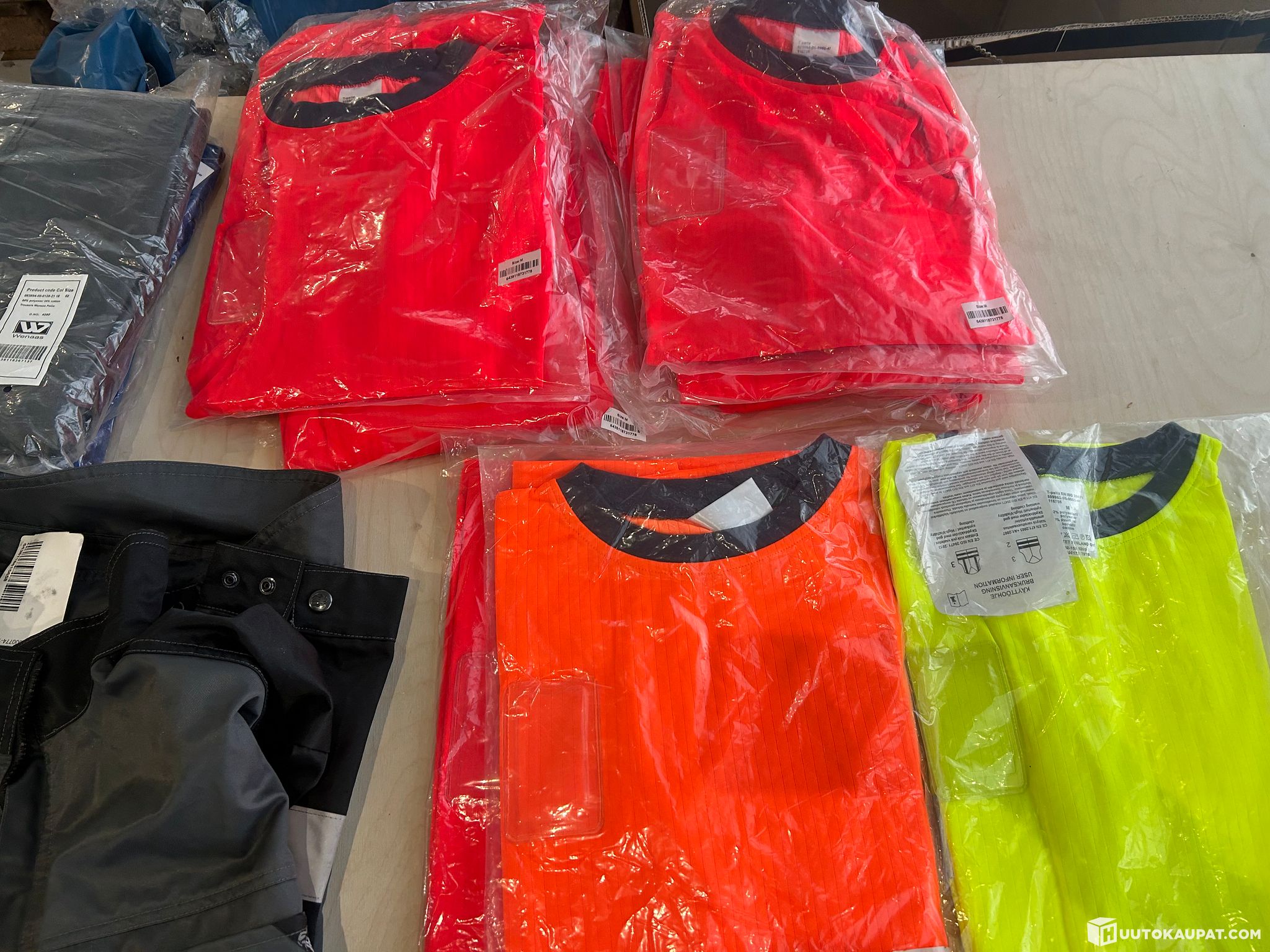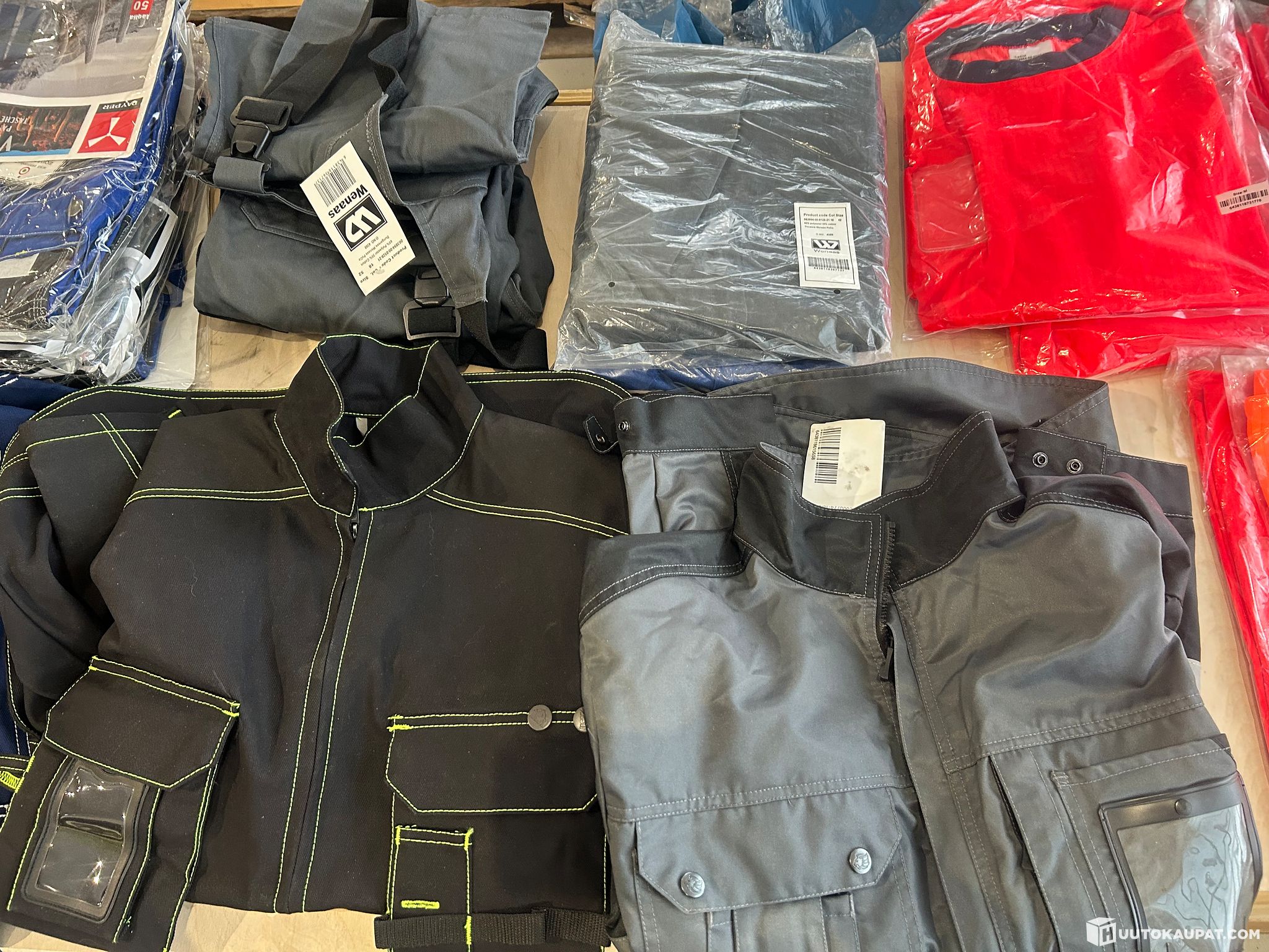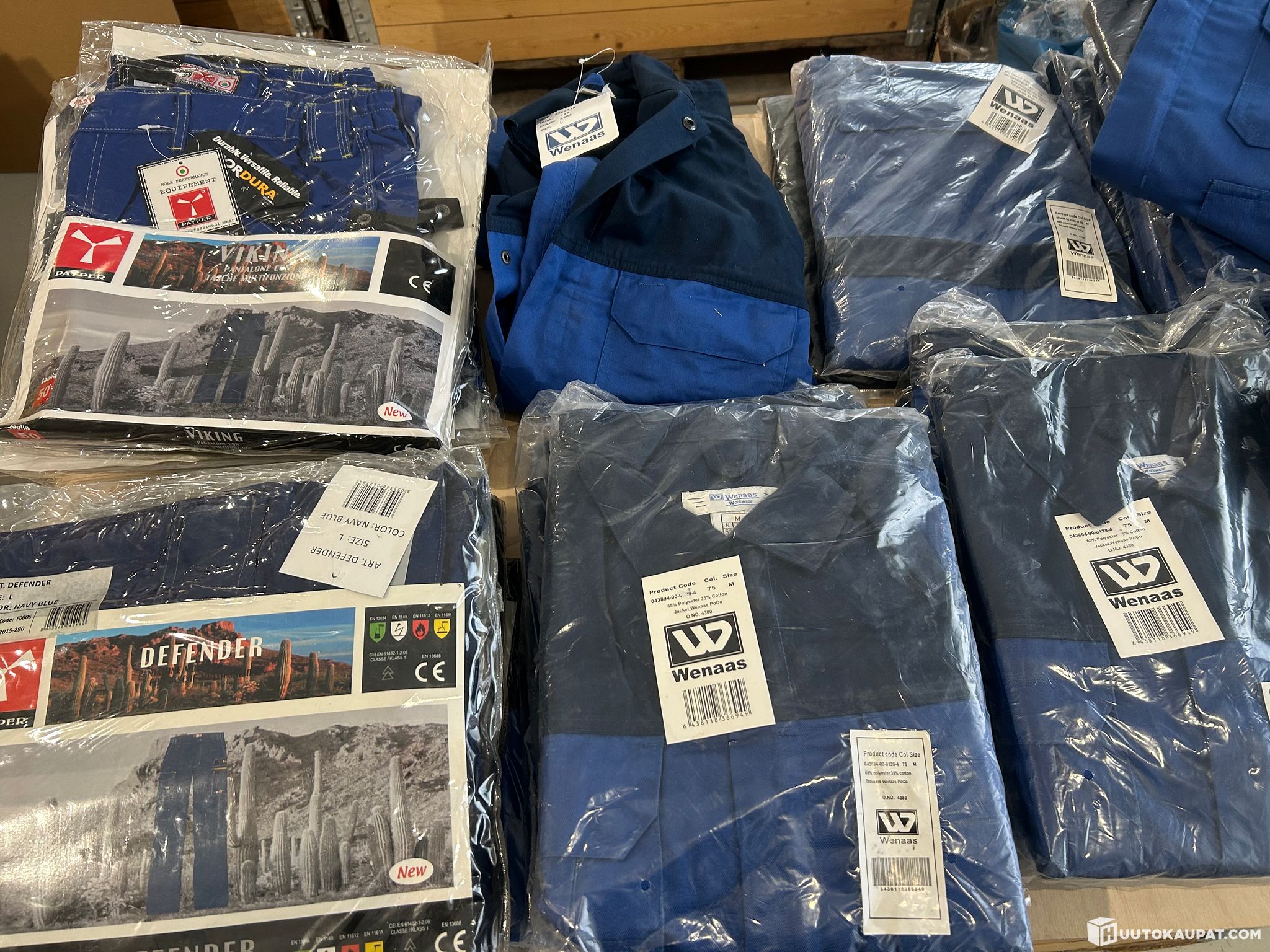 Store 27-piece bulk of branded Leijona, Wenaas, Payperwear work jackets, work trousers, hi‑vis shirts. Sizes: 50, 52, M, L. Batch value: just over €3,000. LOT 3.