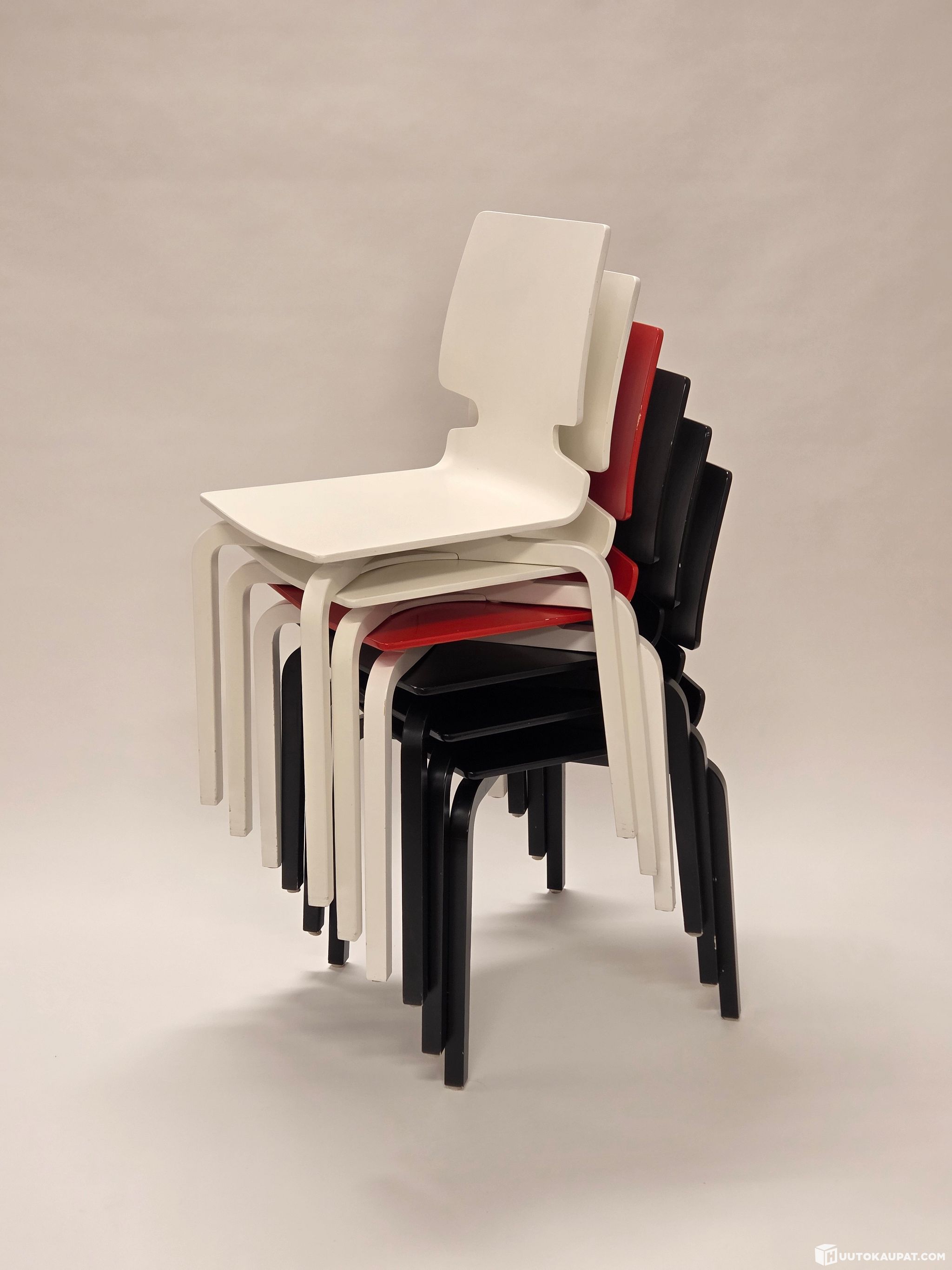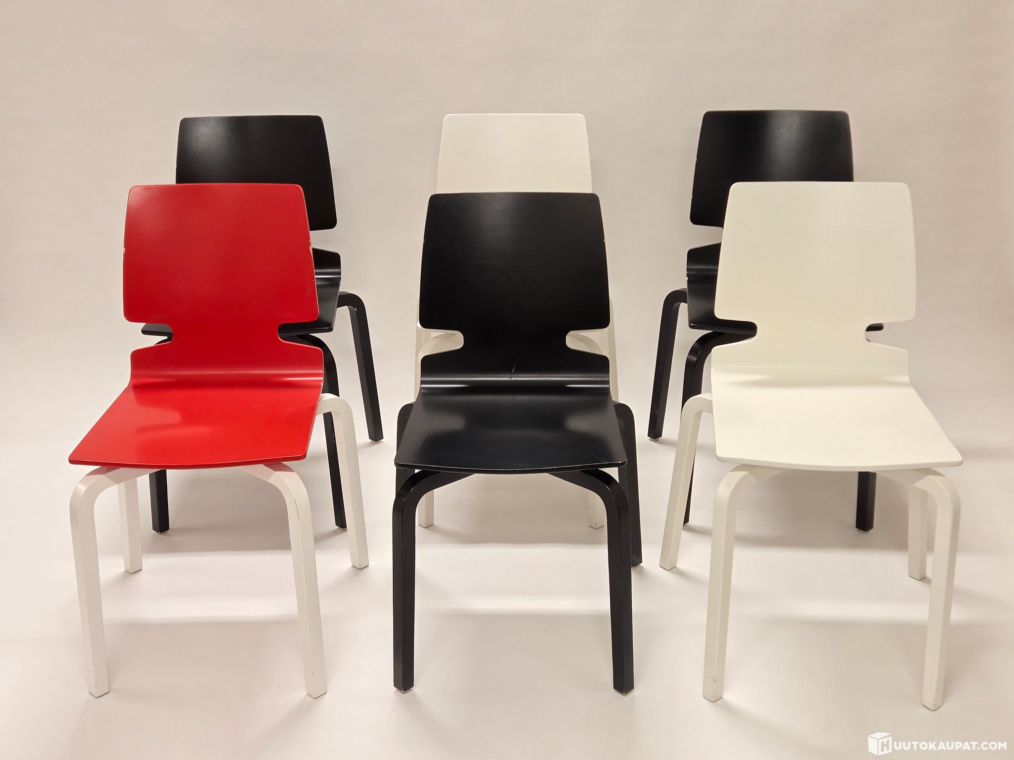 Artek Lento-series chairs, 6 pcs. Designer Harri Koskinen. Three of the chairs are black, two are white and one is red-and-white. All chairs are in good used condition. The chairs are sold together as a set of six. Price includes six chairs.