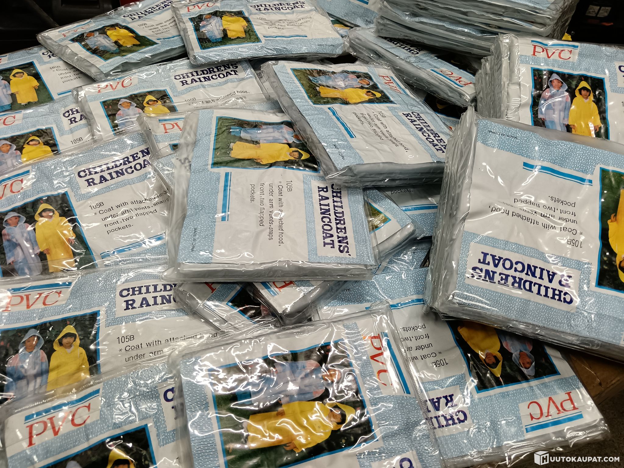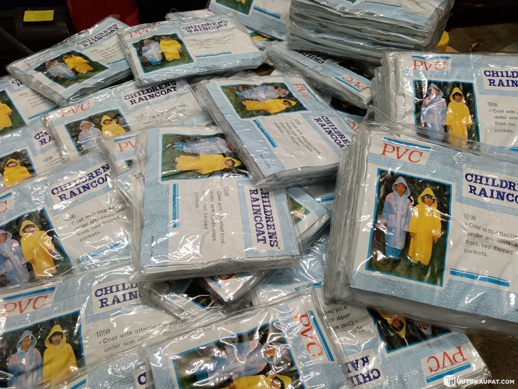 For sale: a batch of PVC raincoats, a total of 99 pieces, all childrens sizes and the same colour. The items are new but have been in storage for a long time. Sale is as a single lot.