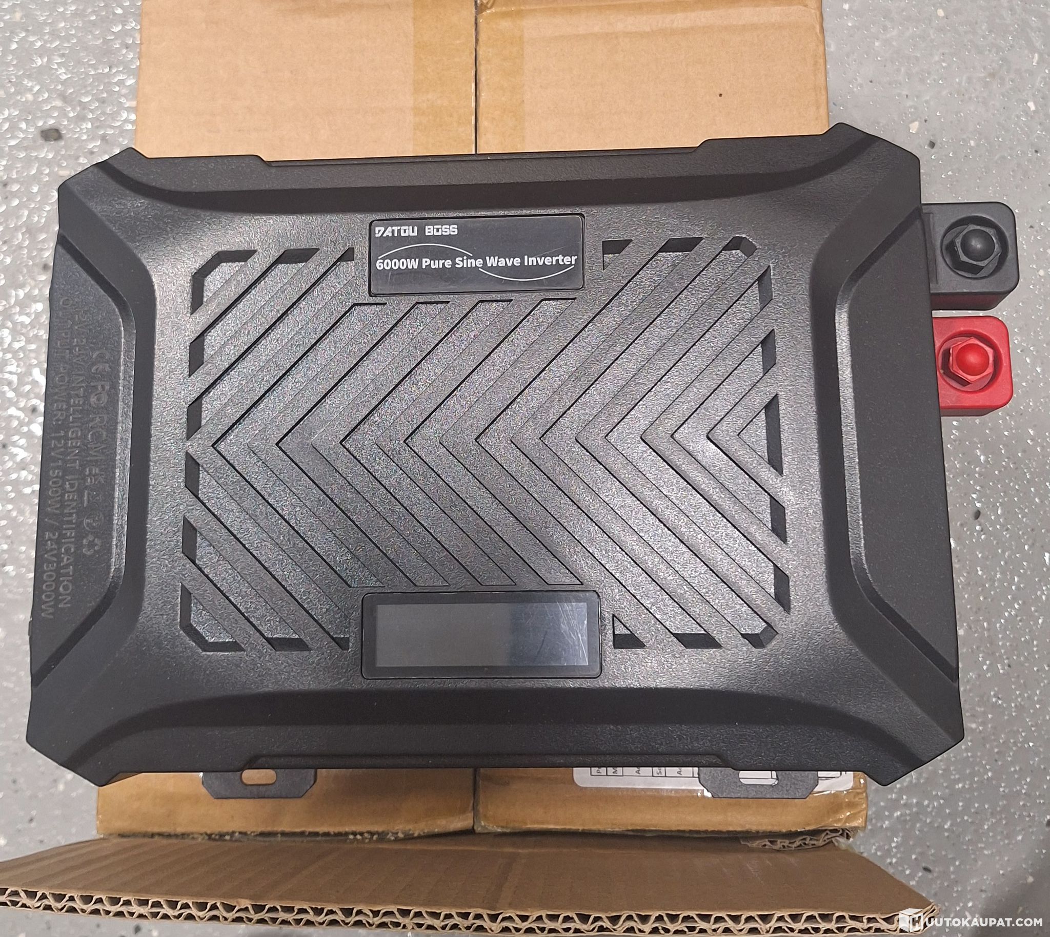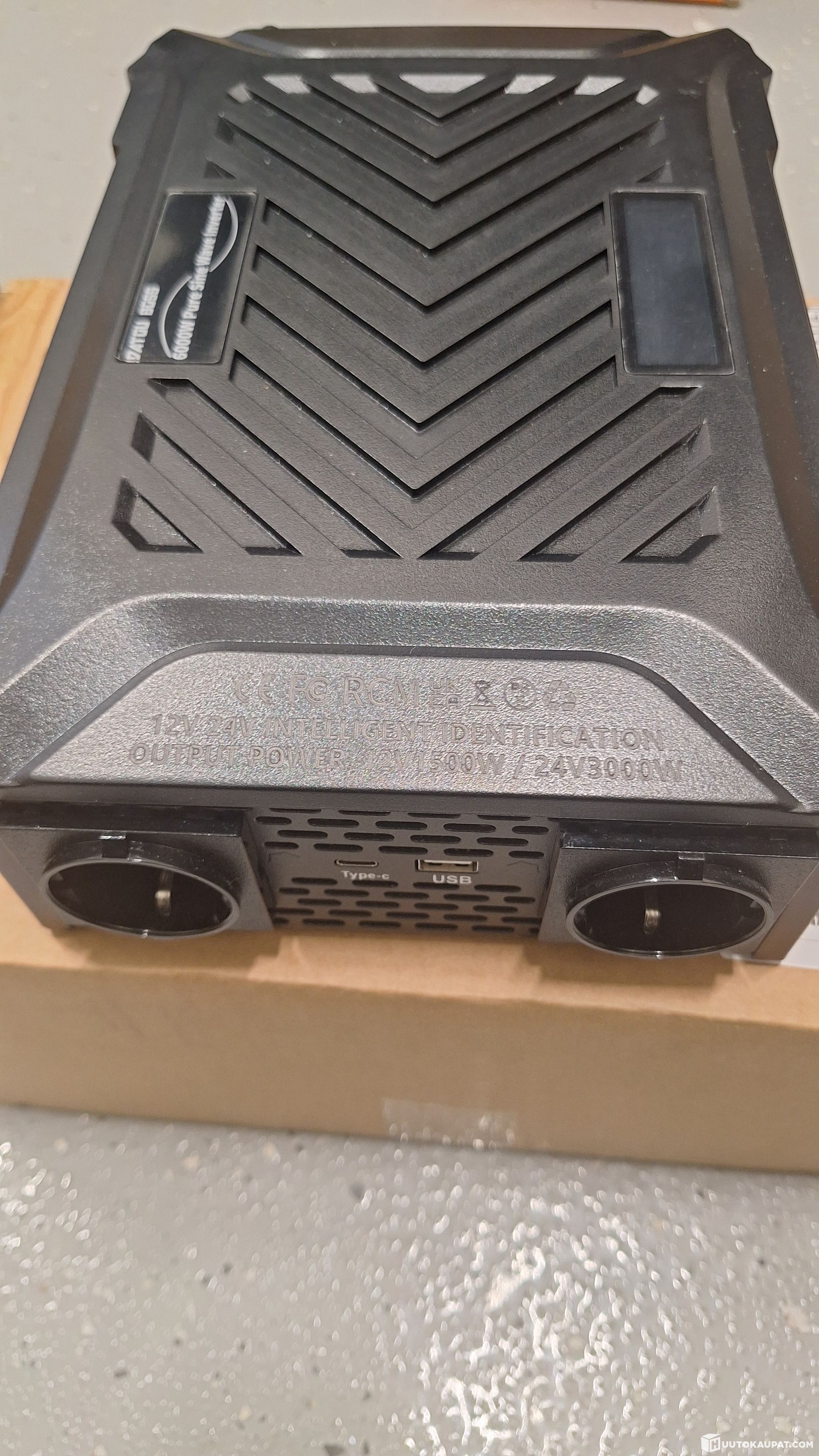 Pure sine-wave converter, 24 V DC → 230 V AC, up to 6000 W peak, 2 AC outlets, USB Type-C, 2.1 A USB port, LCD display