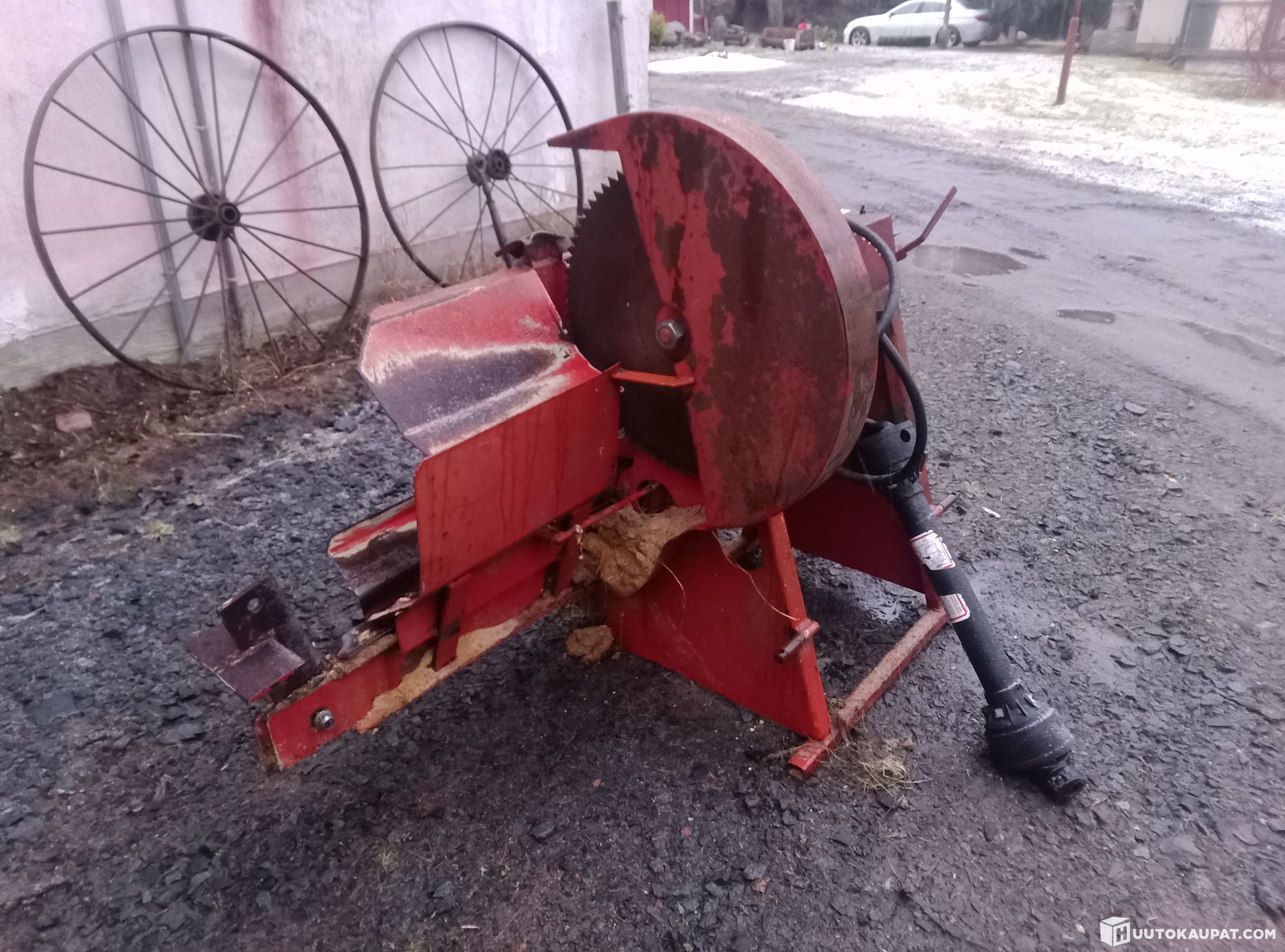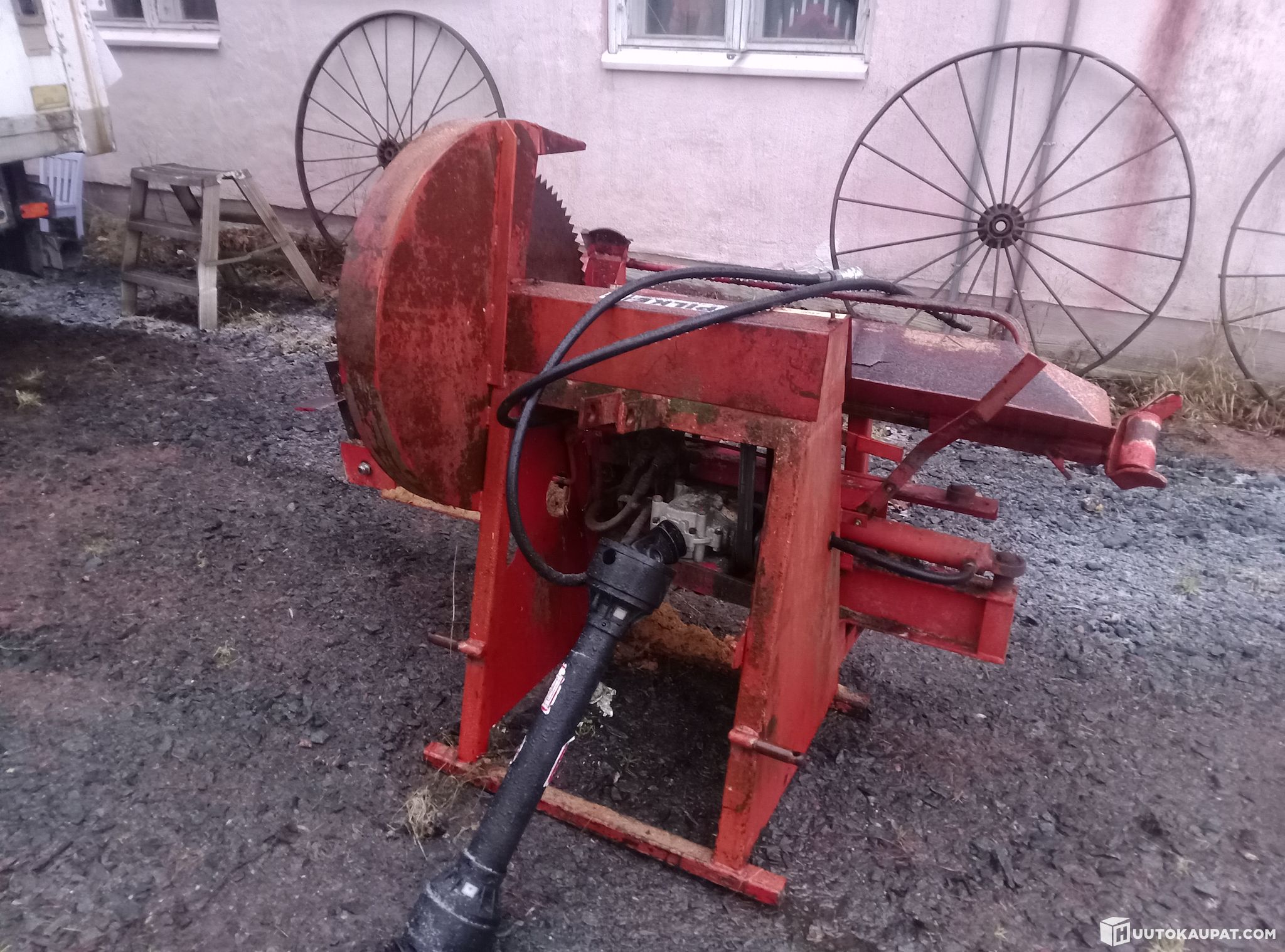 Working firewood processor. Circular saw blade for cutting and hydraulic splitter that divides logs into four pieces. The splitting ram runs from the tractor's hydraulics.