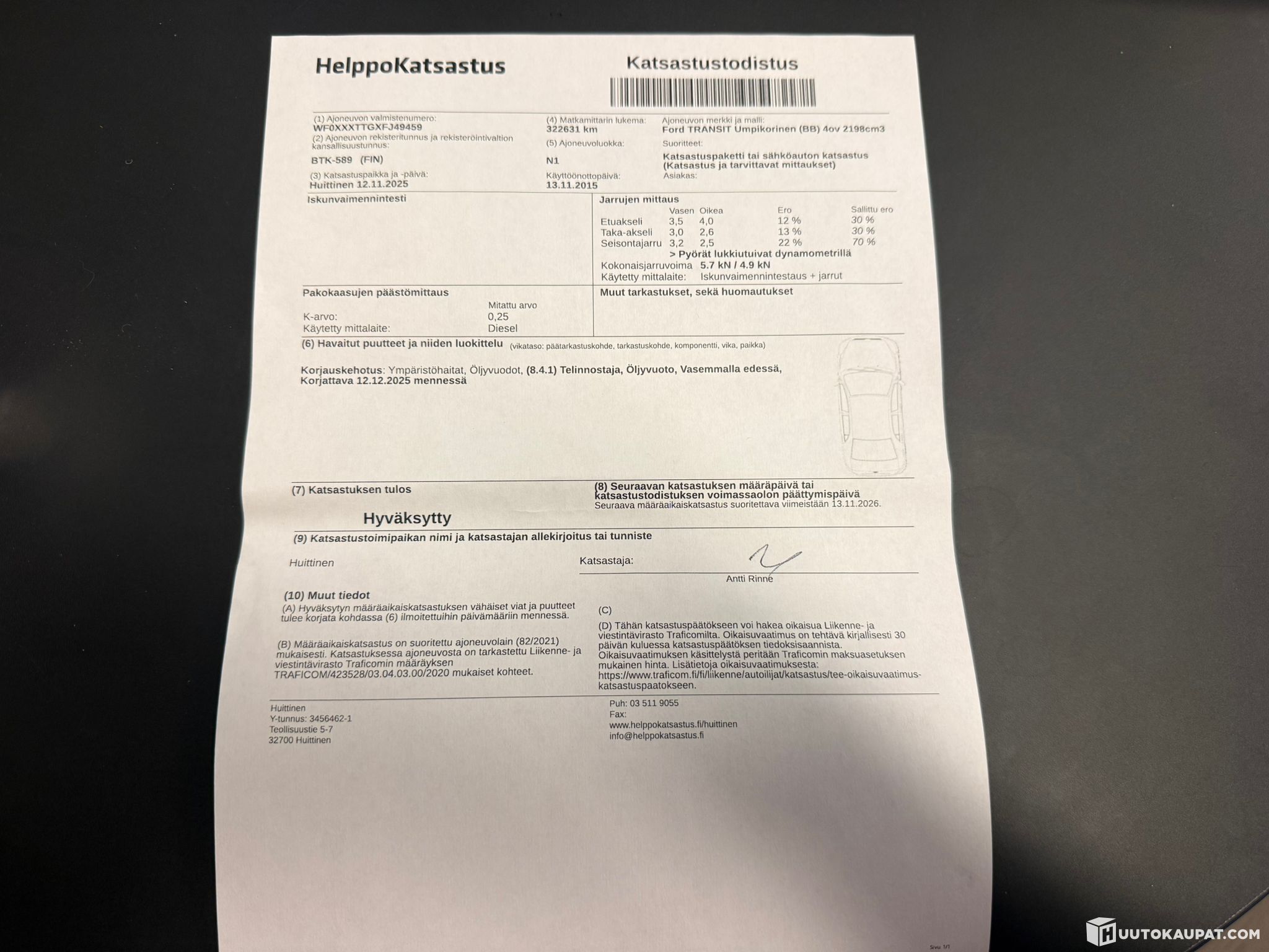 A seemingly intact Transit for the next owner. Inspection issued a repair recommendation: "Telinnostajan oil leak", which likely refers to a power steering hose leak. Refurbished engine replaced by Tammerdiesel in November 2021 at around 178,000 km.