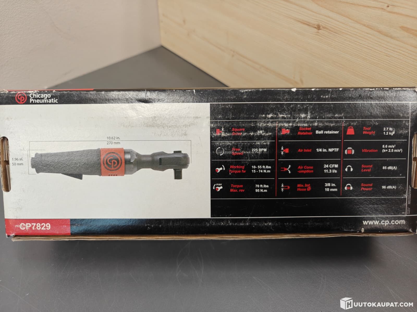 Chicago Pneumatic's powerful pneumatic air ratchet with a 3/8 in (9.5 mm) drive and 95 Nm maximum torque. Particularly suitable for working in hard-to-reach places, e.g. car gearbox and suspension work. The ergonomic composite handle helps keep the user's hand warm.