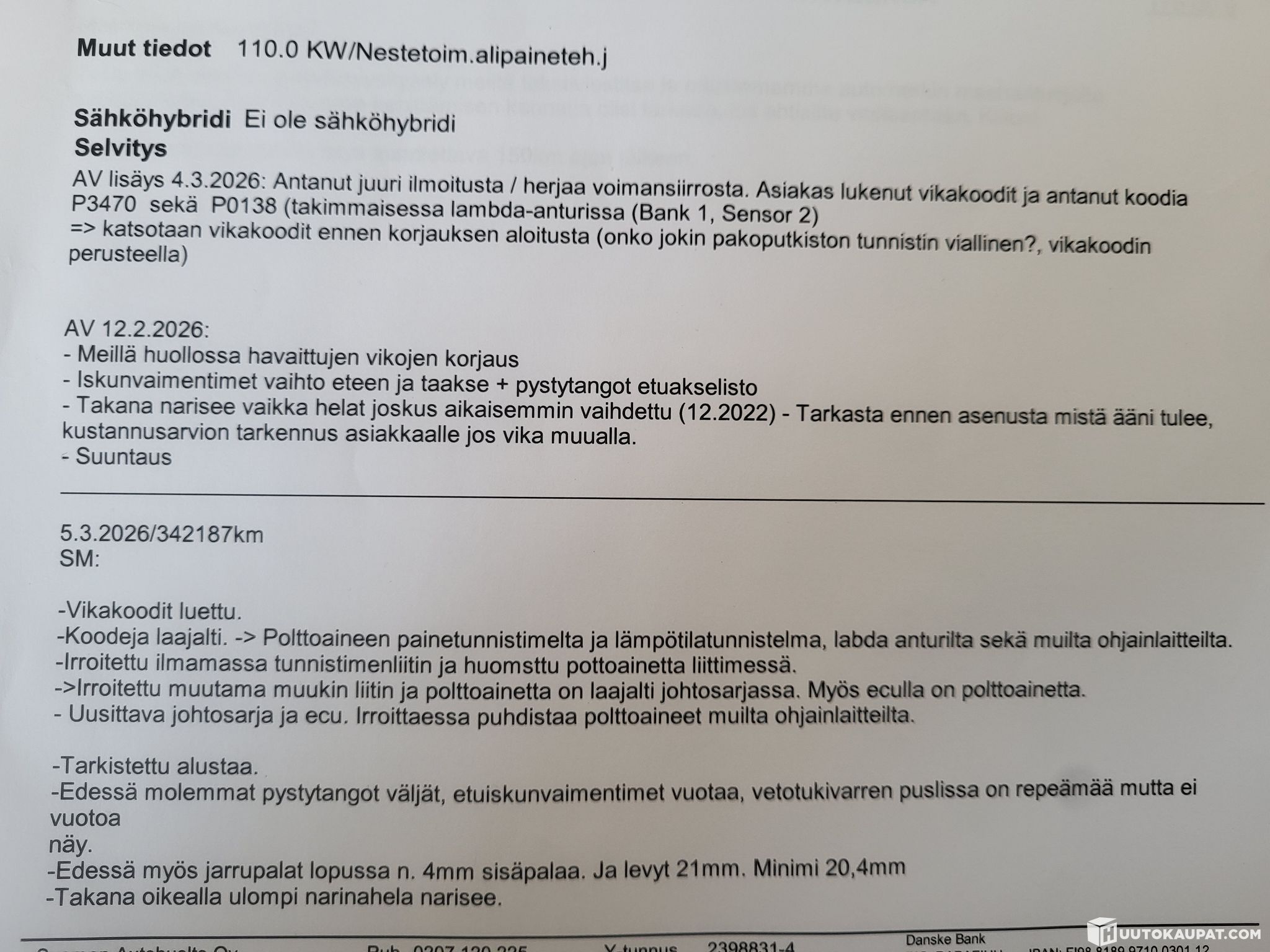 The vehicle was taken to Suomen Autohuolto on 4 March 2026 for diagnosis, where a defective fuel pressure and temperature sensor was found to have leaked fuel through the engine wiring harness into the engine control unit (ECU/DDE).
