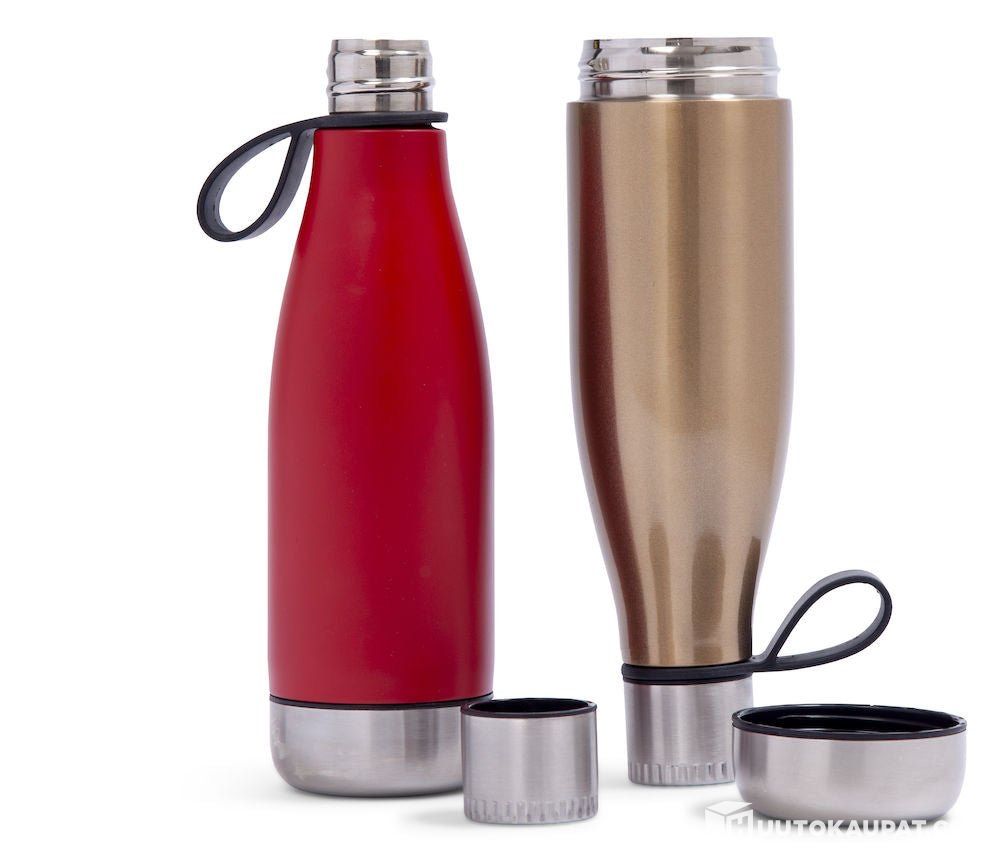 "A durable and stylish stainless steel drinking bottle suitable for hiking, outdoor use and an active lifestyle. Thanks to the removable base it is easy to add, for example, pieces of fruit or ice cubes to the drink. A plastic carrying strap keeps the bottle with you even during more active use.