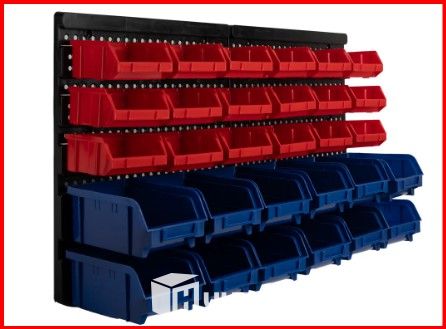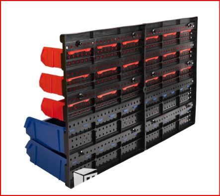 This tool wall with 30 storage compartments is an ideal solution for tidy and efficient organisation of a workshop, garage or hobby room.