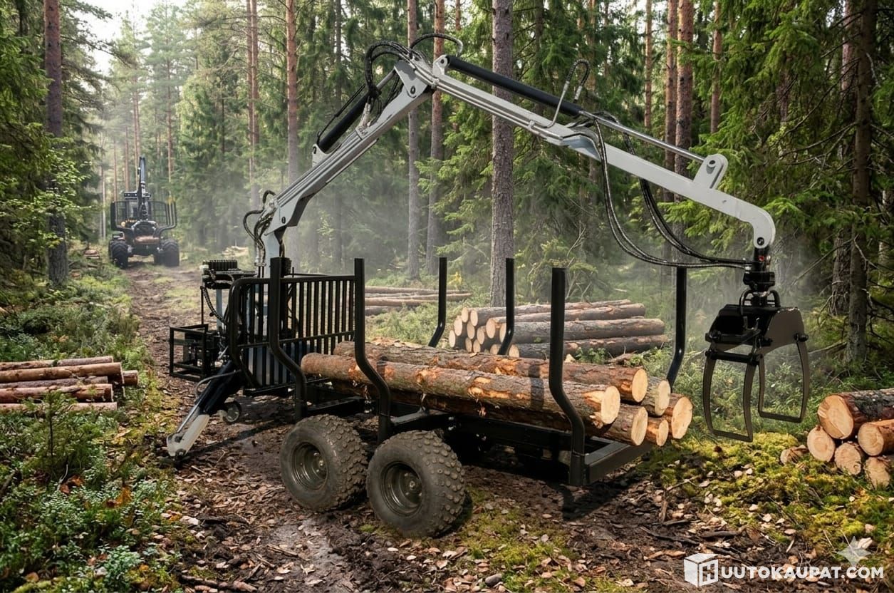 The hydraulic log trailer with crane is designed for professional use. It is equipped with its own high-quality hydraulics and is delivered as a complete package, which includes the trailer, a hydraulic crane with a 180° rotating grapple, an extension boom, a winch, sturdy stabiliser legs, six side stakes and a powerful 6.5 HP four-stroke engine.