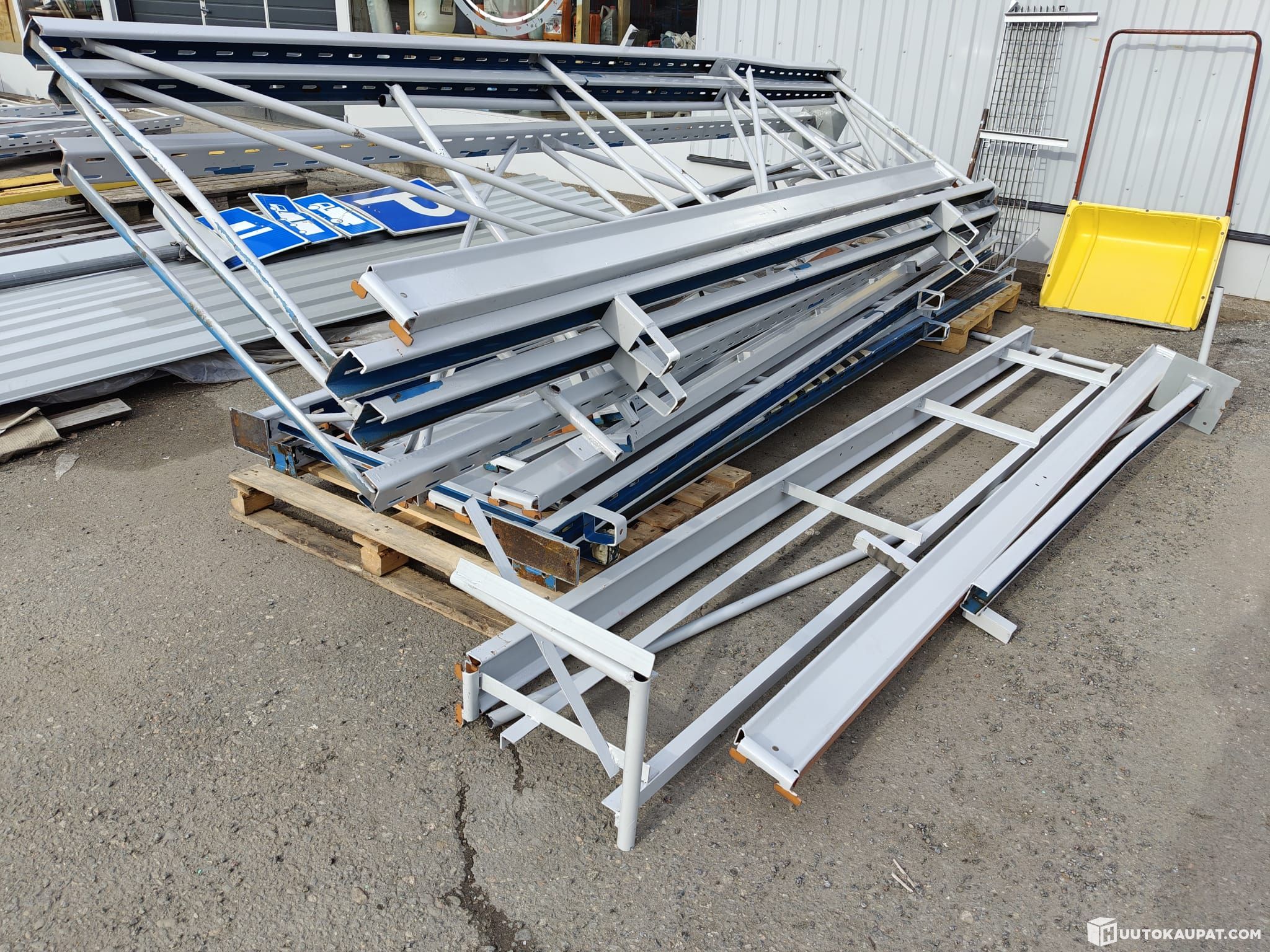 For sale: metal-frame warehouse/forklift pallet racking! Total length with all parts approximately 13 metres and height approximately 4 metres.