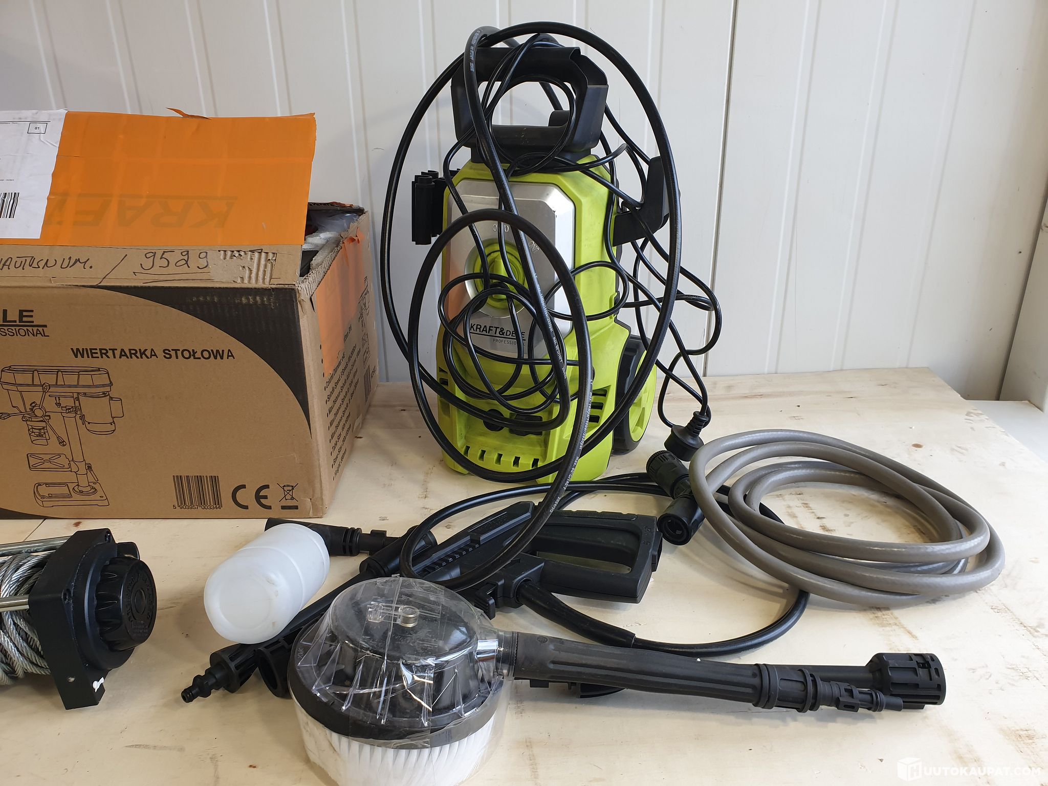 Column drill, pressure washer, battery-powered backpack sprayer, winch, hydraulic puller
