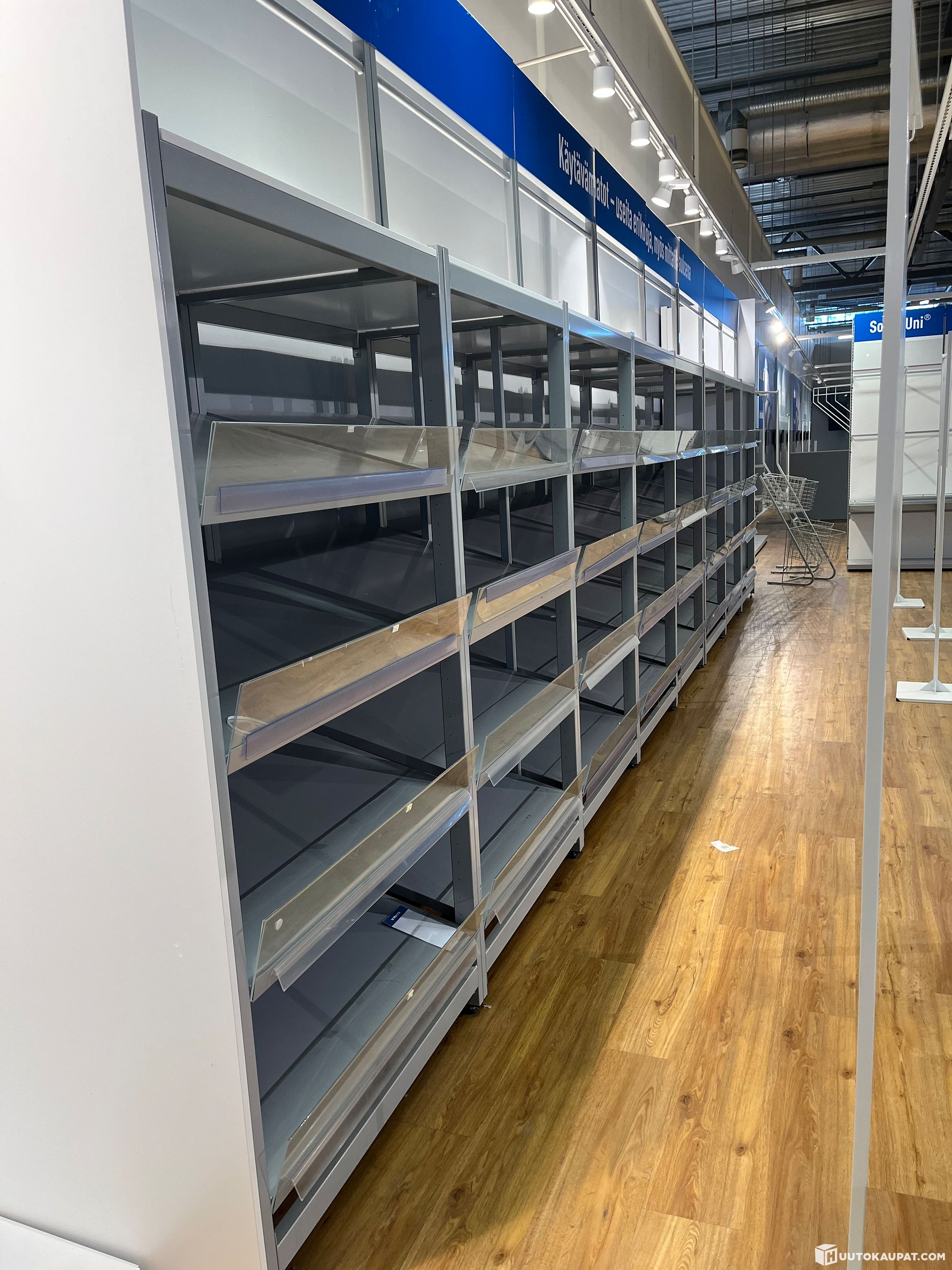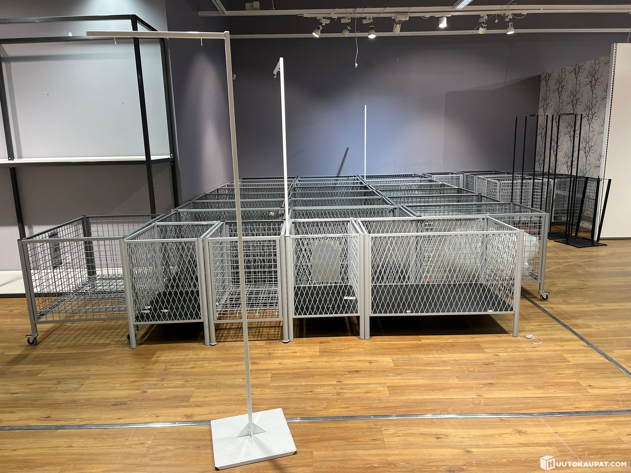 LARGE QUANTITY OF SHOP FITTINGS INCLUDING: wall displays – 15 small and 1 large – and an advertising pylon. Approximately 23 grey transport baskets with wheels and 13 without wheels. Wall shelving, 15 carpet tables, 2 round tables, etc.
