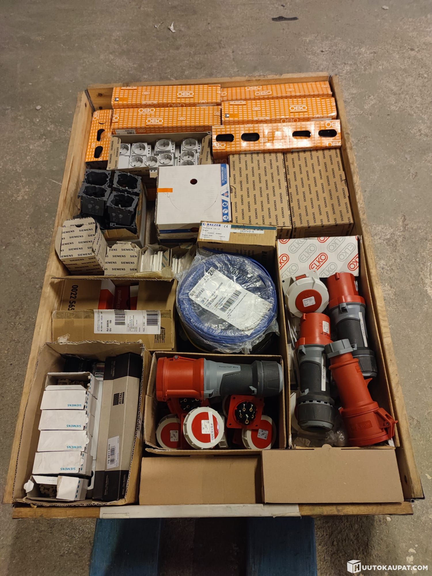 Pallet as shown in the pictures containing various electrical installation supplies and components. The lot is sold as a single unit and contains approximately the following quantities:
