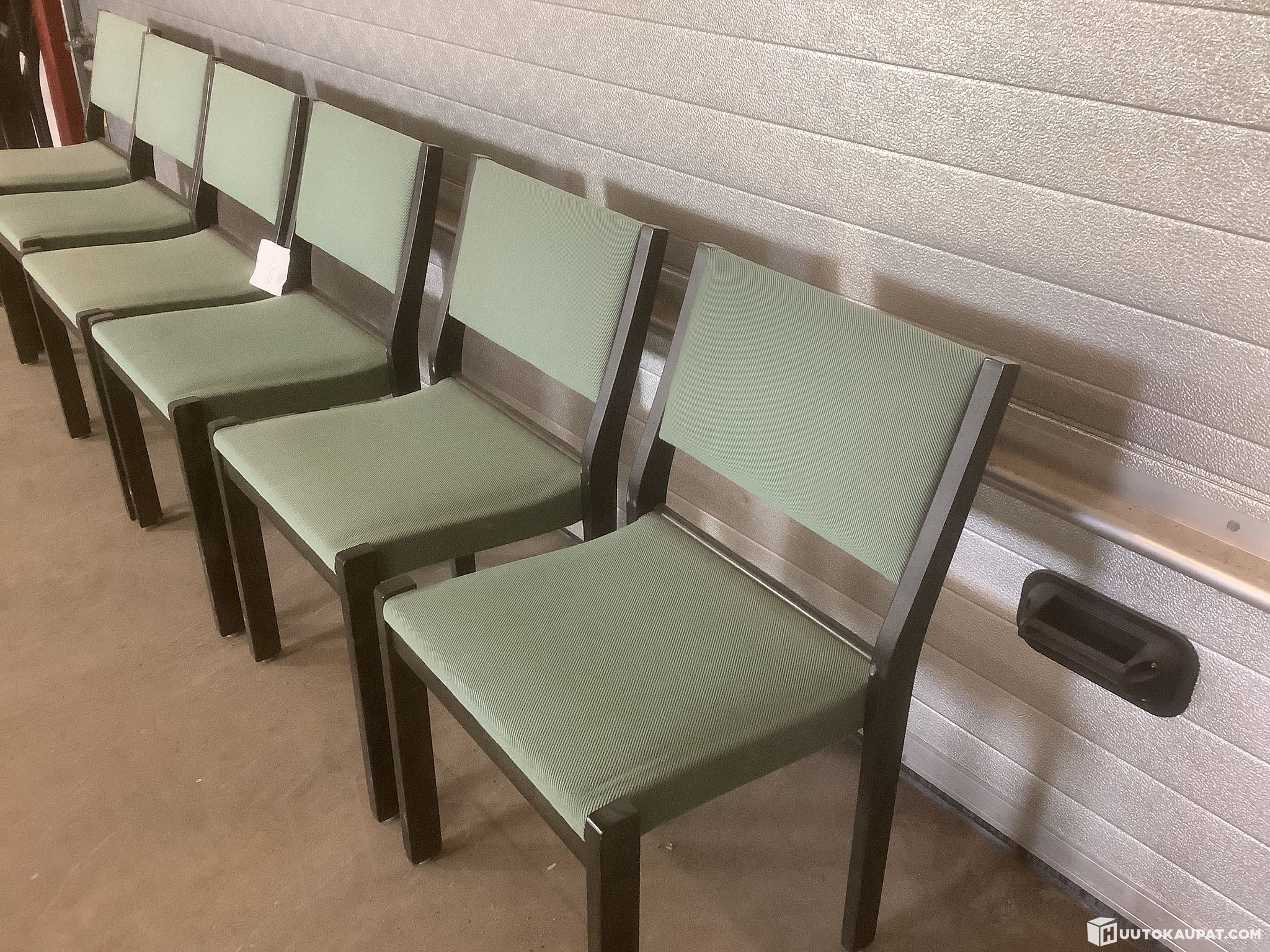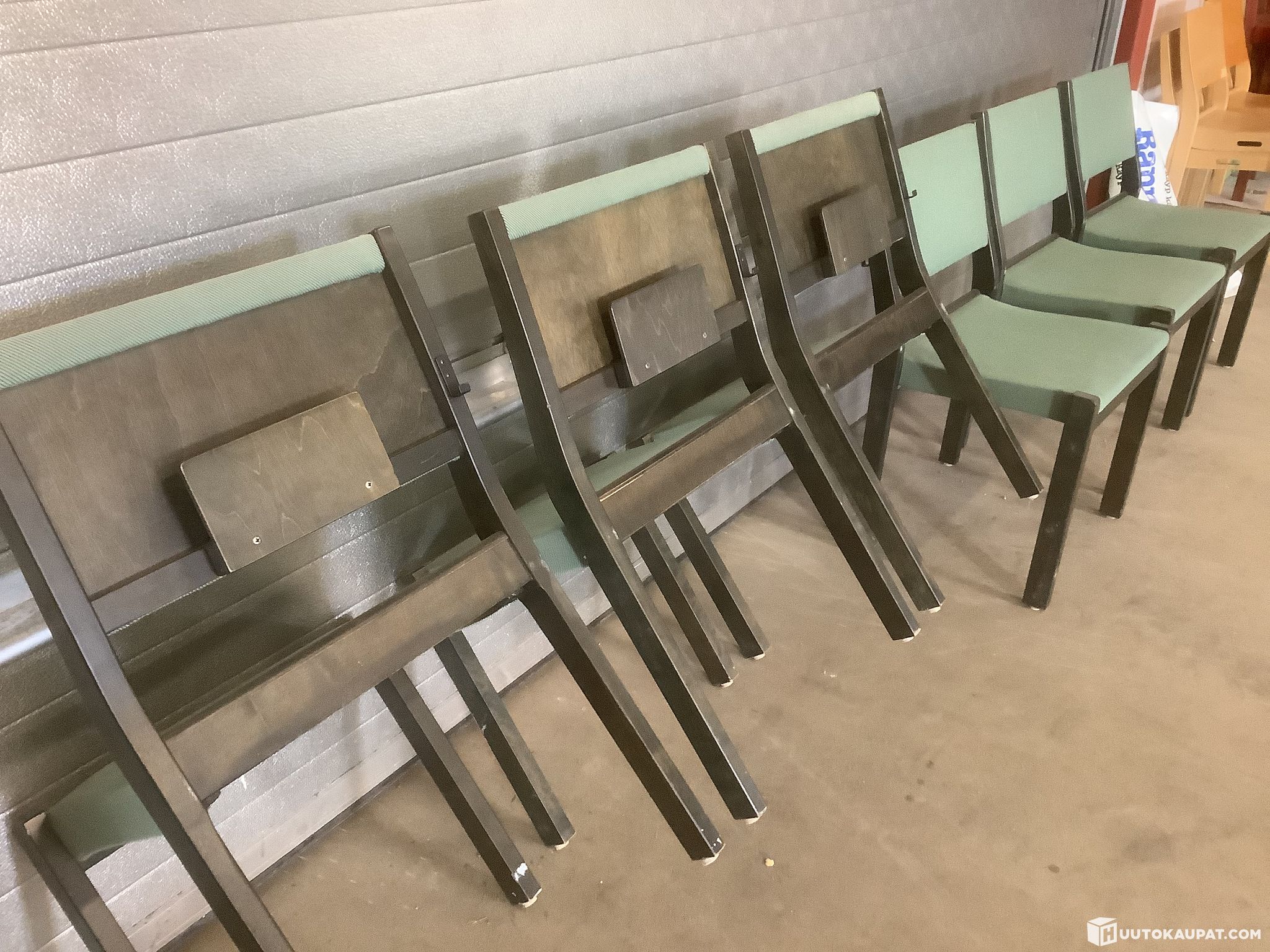 Artek chairs with green upholstery and wood parts stained black. The chairs have been used by a church; the backs feature a book compartment and a hook.