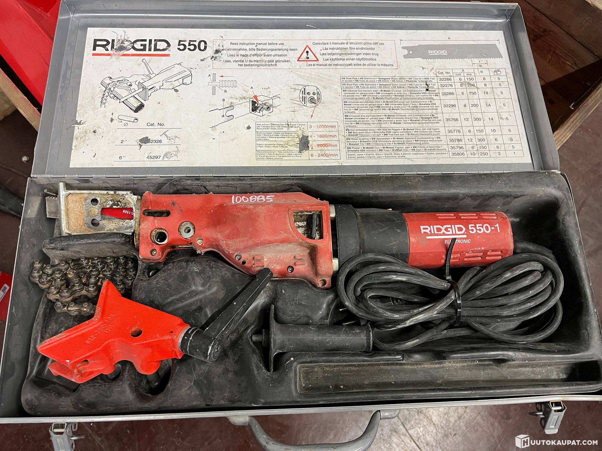 Reciprocating saw for cutting wood, steel and plastic. The machine comes with a chain clamp.