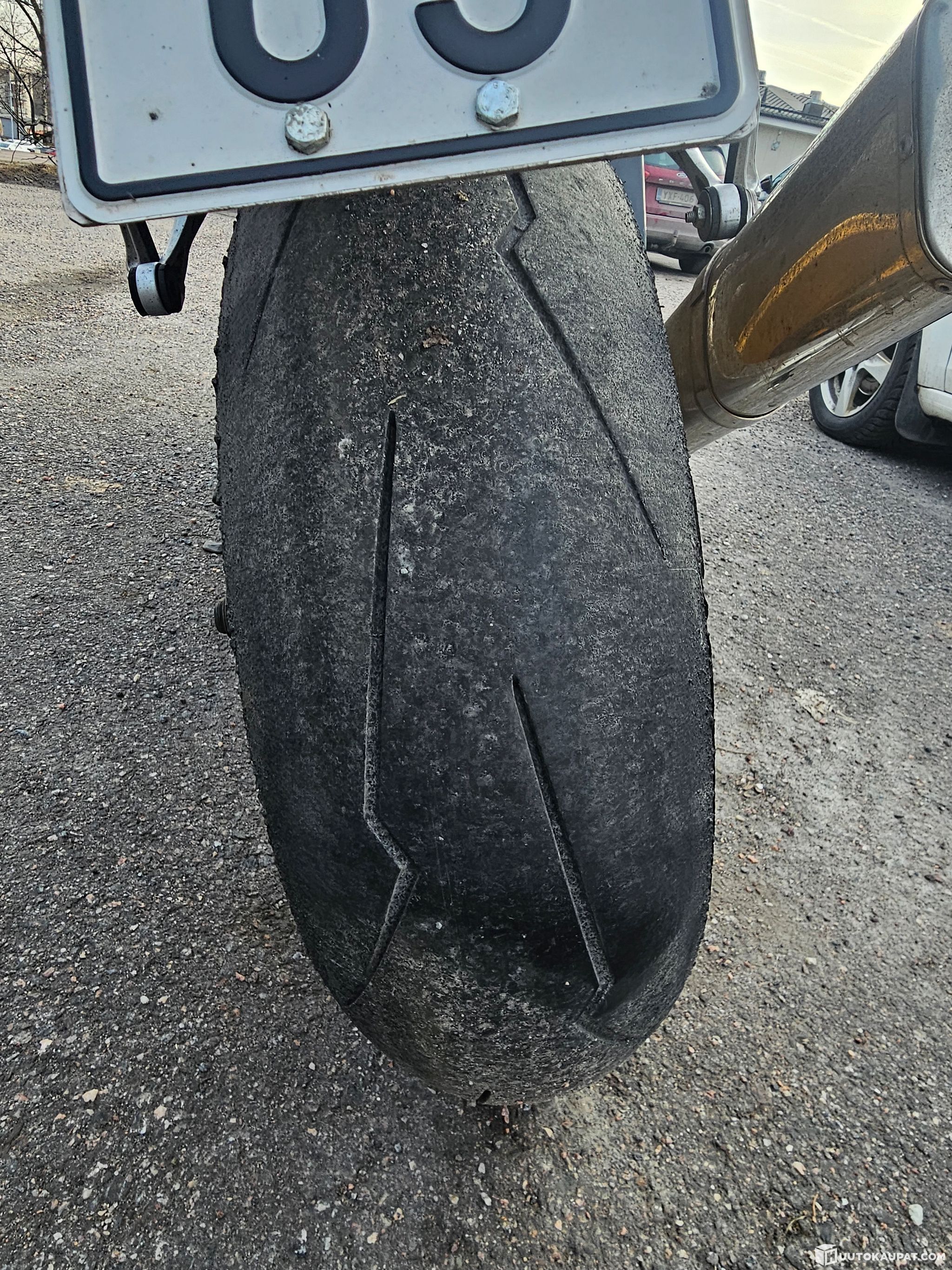 The front tyre is new; the rear tyre has tread, but the compound is starting to soften.