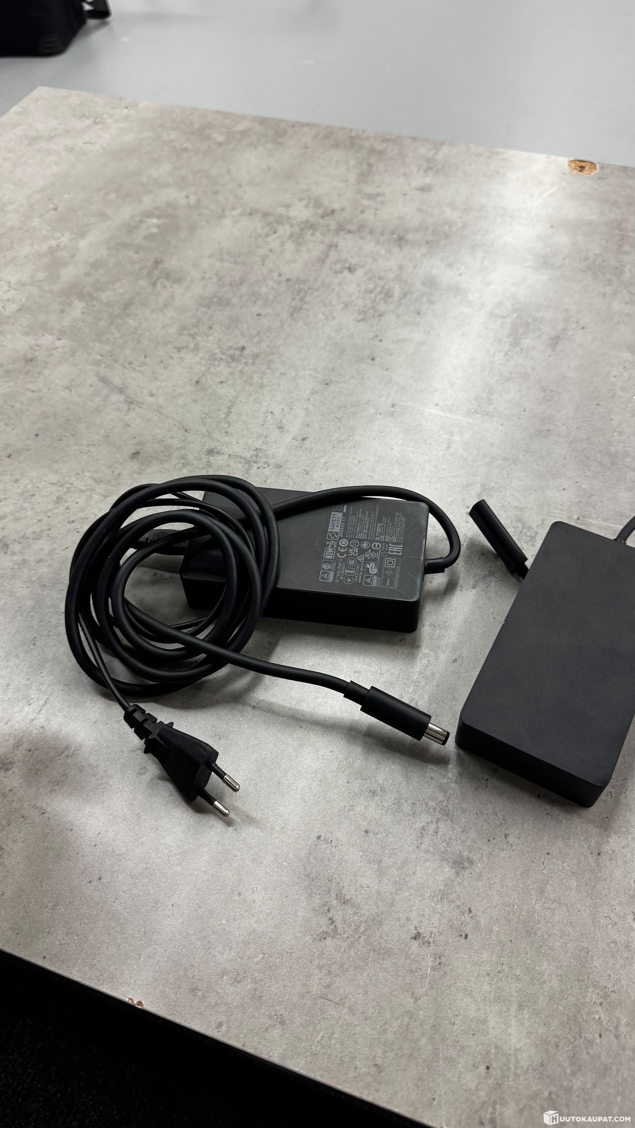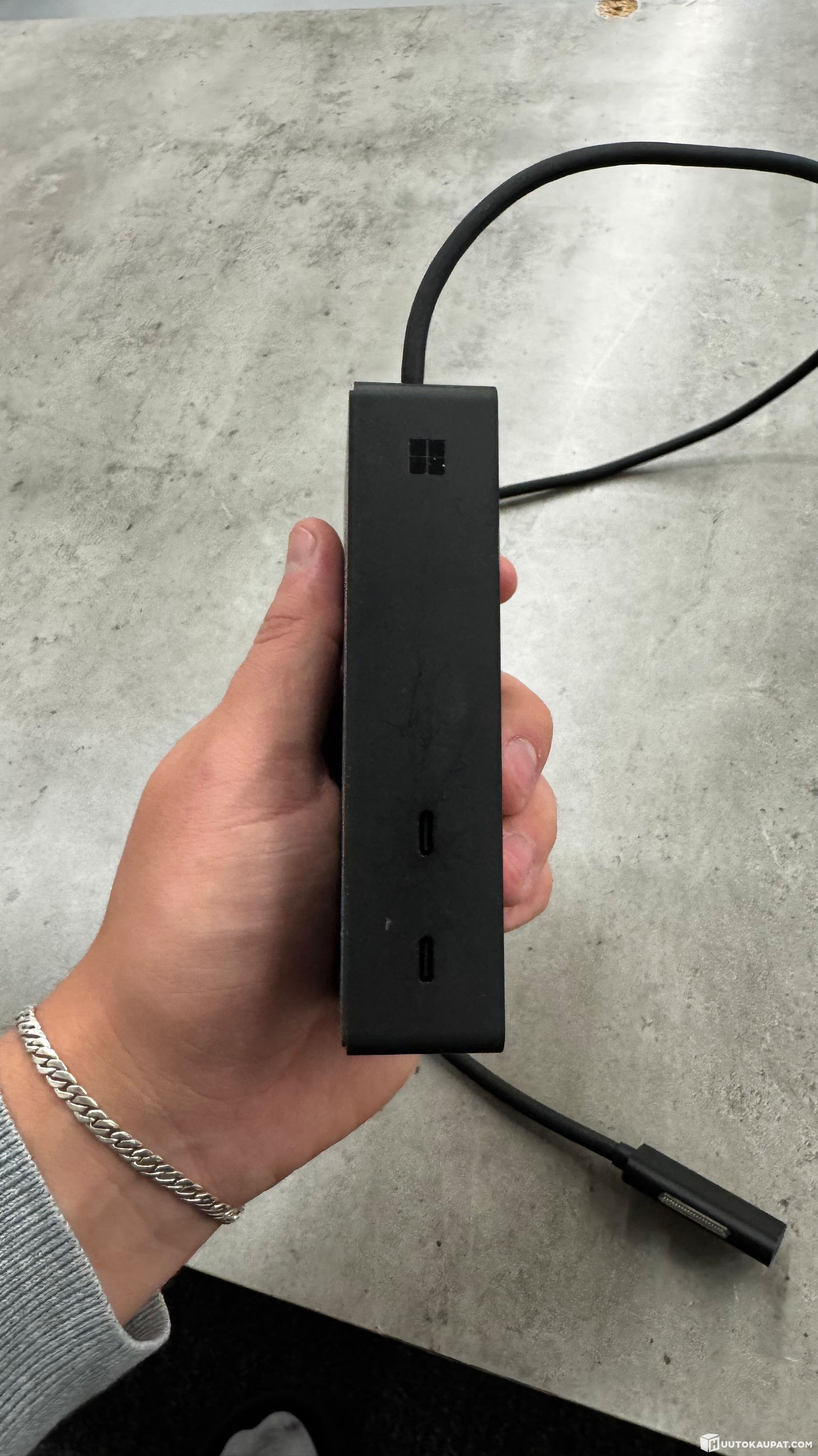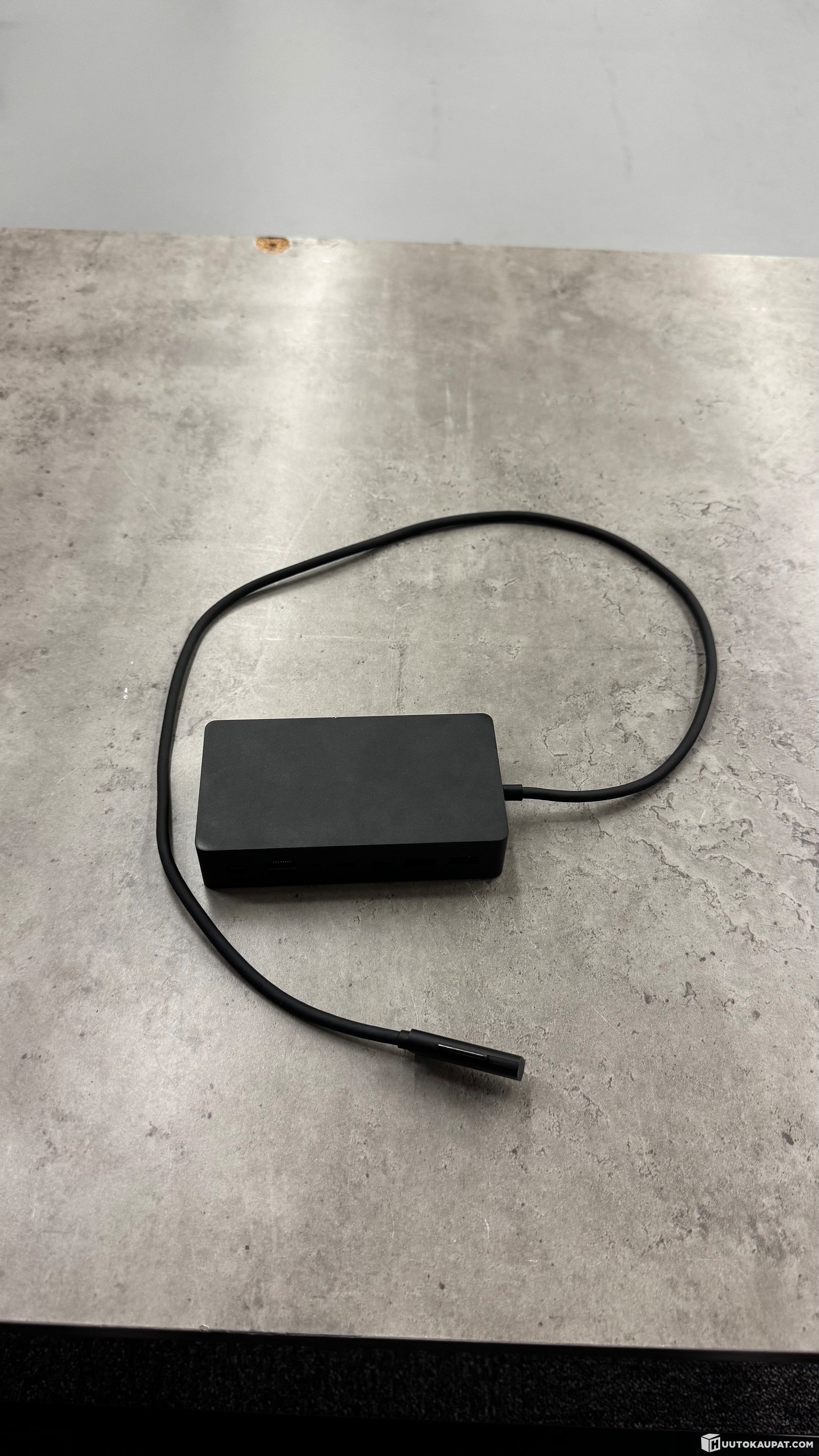 Microsoft Surface Dock docking station. Black dock with a fixed Surface connector for connecting a laptop. The device features several ports, including USB ports, an Ethernet (RJ45) connector and a power connector. Suitable for connecting Microsoft Surface devices to peripherals and network with a single cable. Power supply and network cable are shown in the pictures.