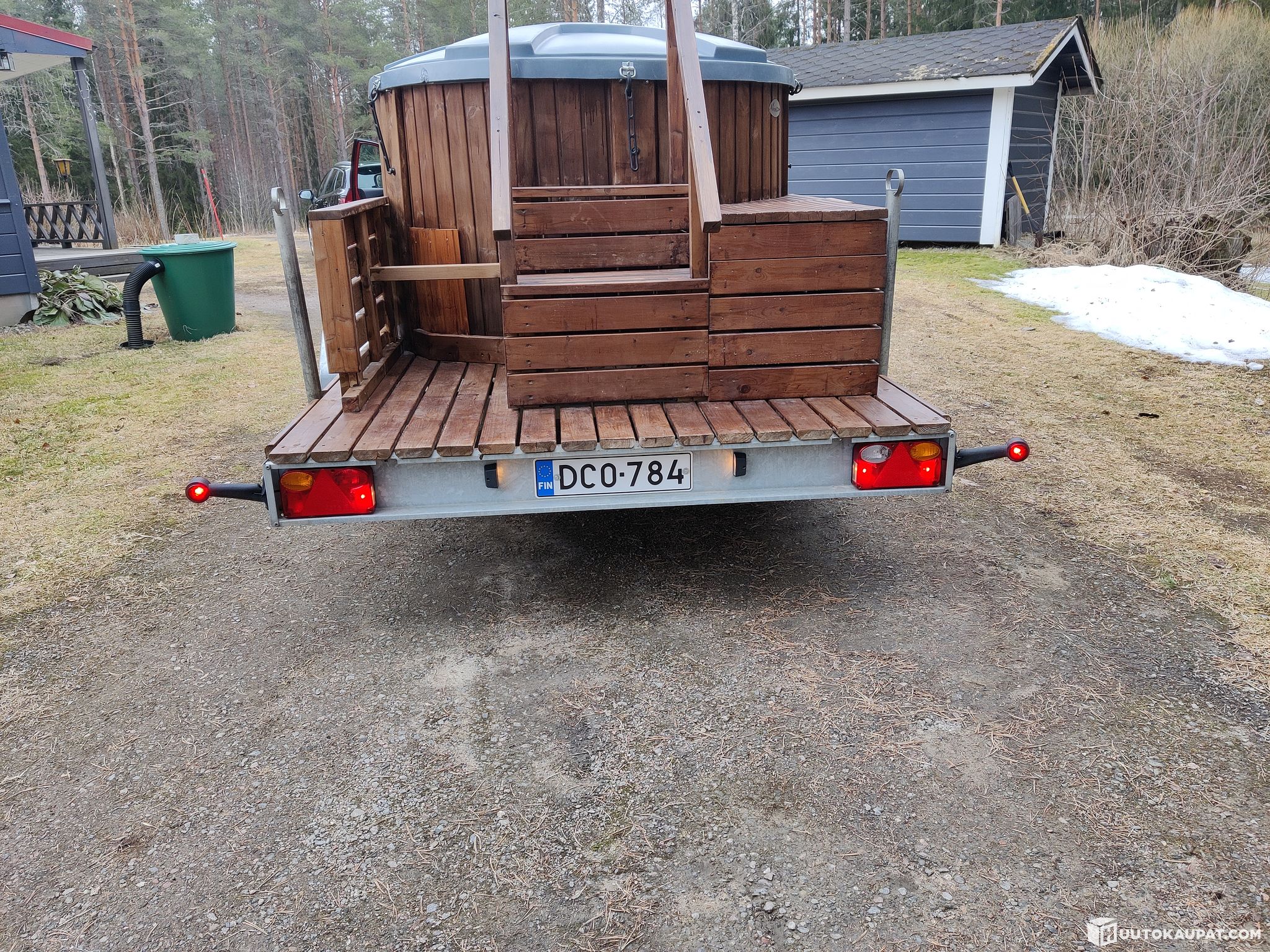 The trailer is a JJ-Traileri and the hot tub is from Vekas.com. The hot tub trailer is well used but intact and ready for bathing.
