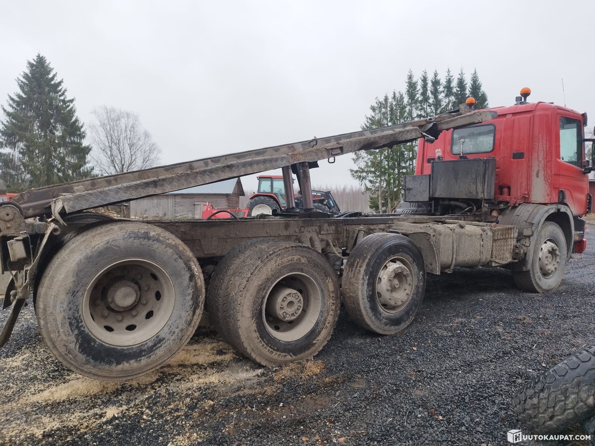 Has toppled from its position onto its left side. The tipper is split at the first extensions. New winter tyres on the bogie and at the front. PTO and crane hydraulics. A new clutch was fitted in winter. Mechanical condition is good and it can be moved by driving. It has a valid inspection and the motor insurance is still active. Can be made drivable by welding the bogie ear and replacing the tipper. Good payload of just over 21,000 kg.