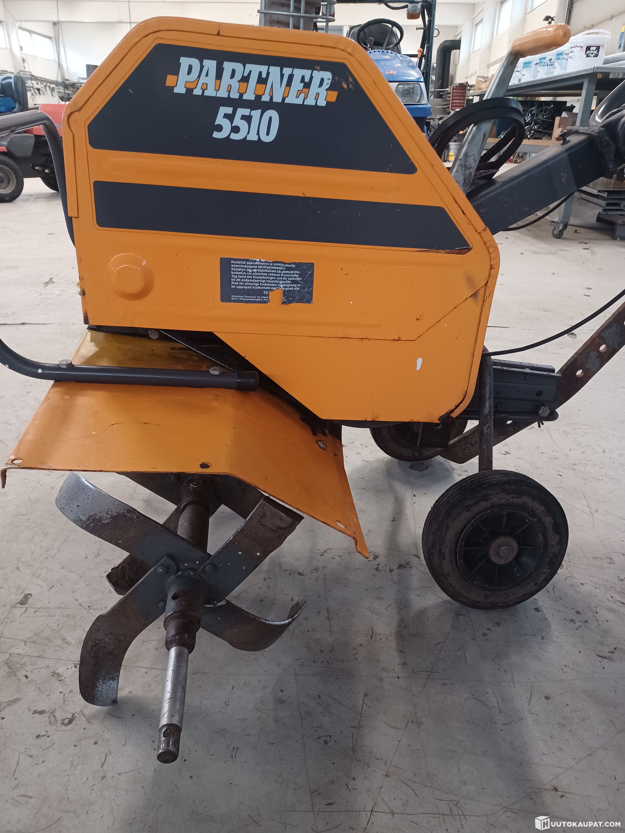 For sale: a Partner 5510 garden tiller that has been unused for years and is sold for repair. We tested it — the engine starts and the tines spin, but the drive does not disengage from the handlebars, so a minor repair is required. Includes a couple of spare belts.