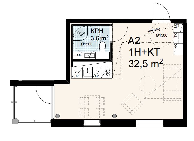 The apartment for sale is a 32.5 m² studio on the first floor. It has its own balcony, and the spacious studio suits a resident who values practicality and modern solutions. The kitchen is fitted with modern integrated appliances and the apartment includes a dishwasher and a washing machine connection. Modern surfaces, underfloor heating and a well-equipped bathroom make living easy and comfortable.