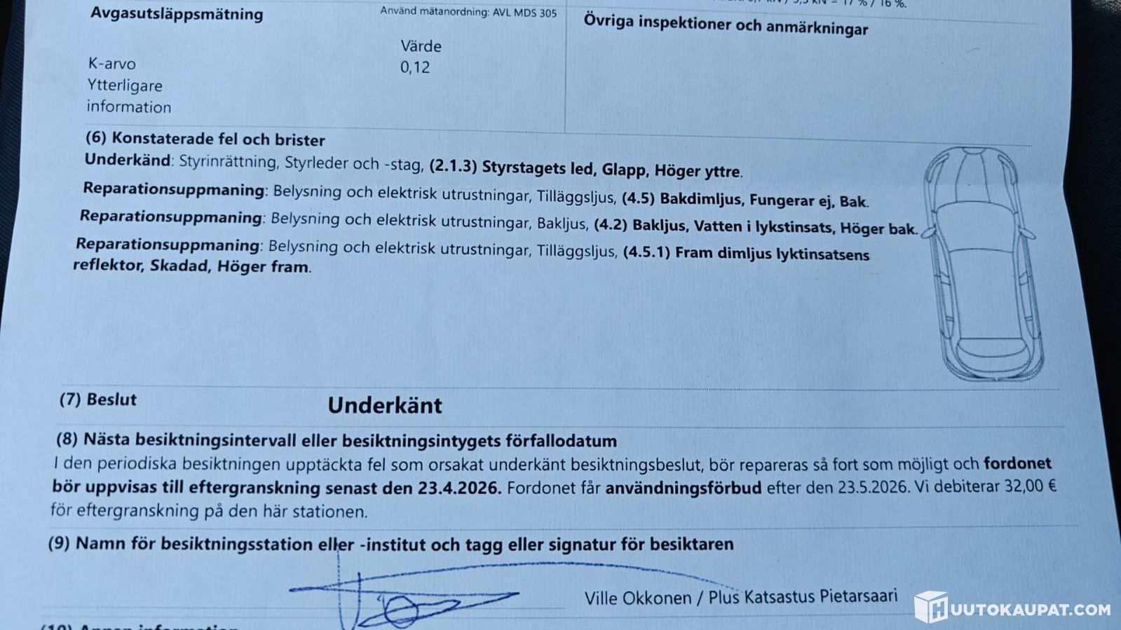 The car failed inspection due to play in the tie-rod end; a garage repair estimate is approx. €300 (see pictures). There were also advisories from the inspection for the fog lights and water in the left rear light. The car comes with both friction and studded tyres!