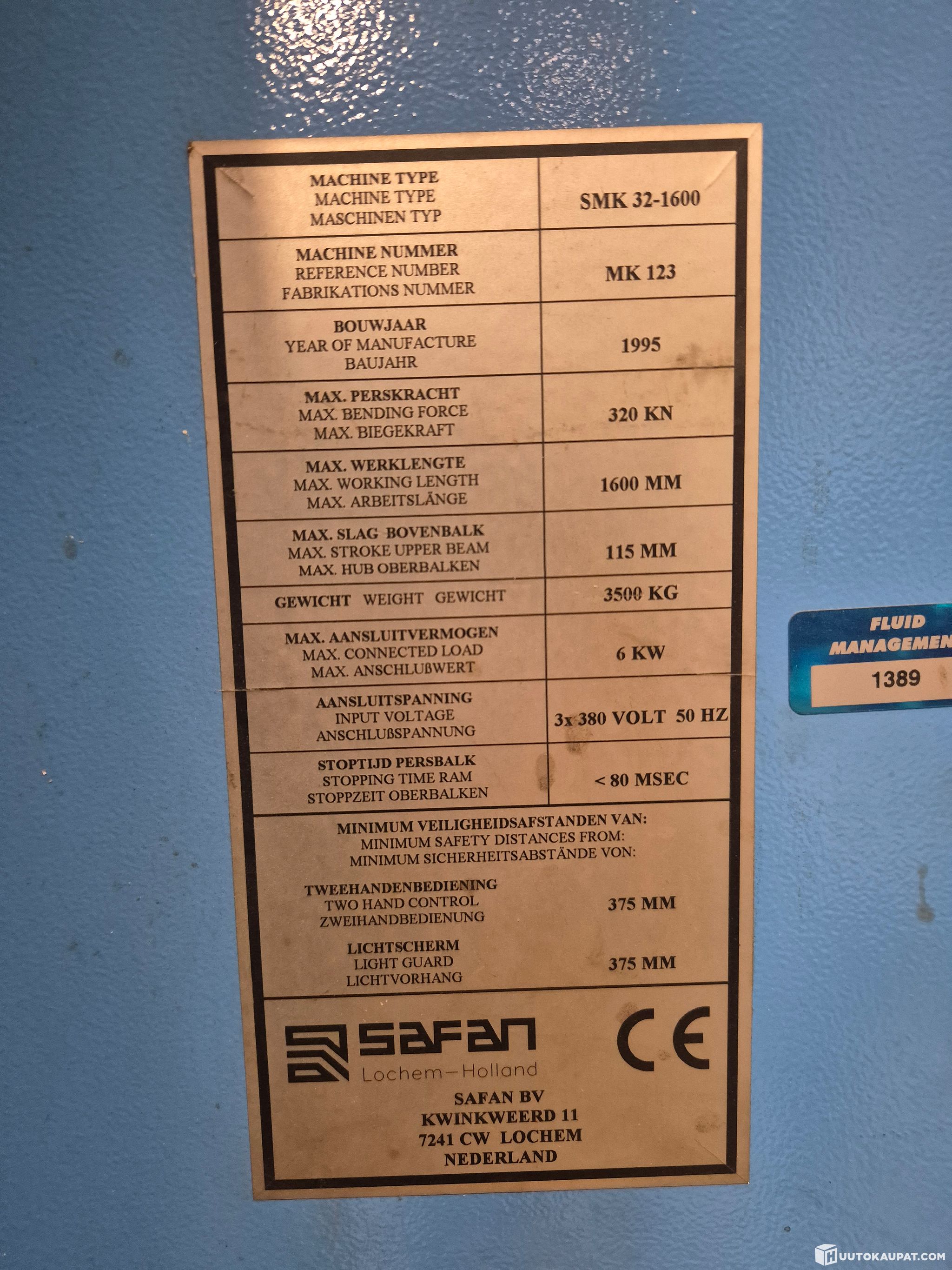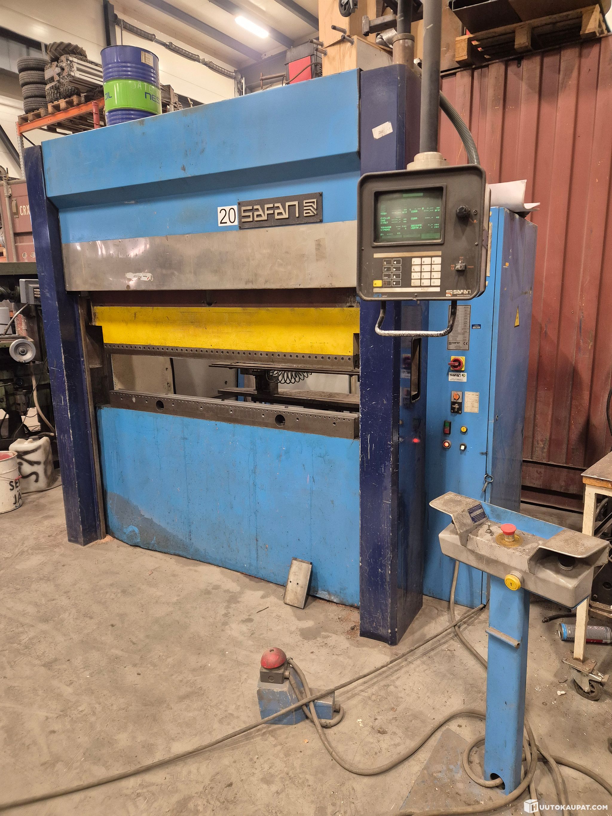 Safan press brake. Worktable 1600 mm, capacity 32 tonnes. Year 1995. The electronics and display work and the blade moves slightly; there appears to be some software fault. In addition, the hydraulic blade holders leak oil. Included are upper and lower blade holders. No blades included.