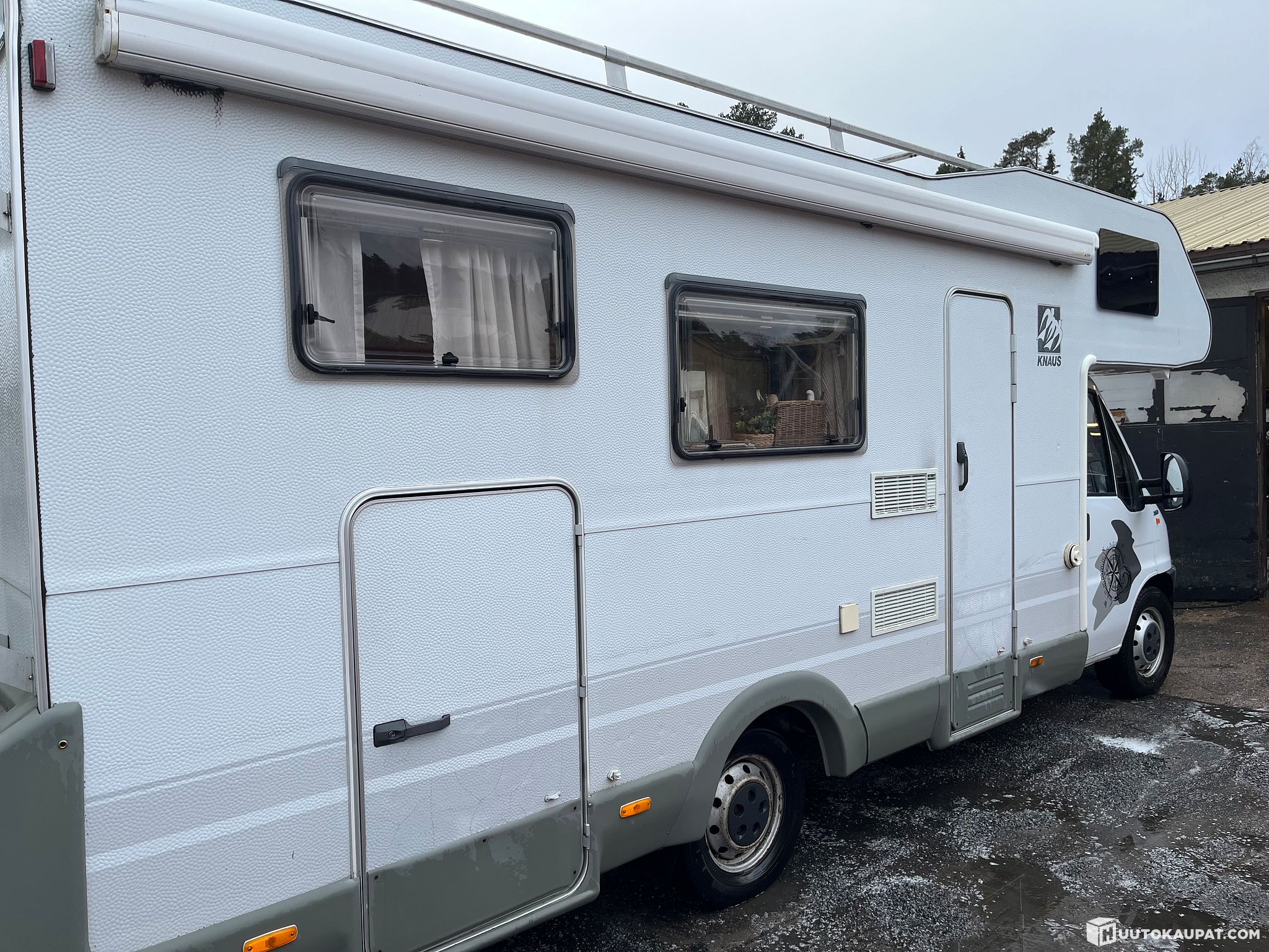 The awning requires servicing and a new fabric. Trumatic heater, leisure batteries, fridge, gas hob, engine block heater. The fridge and heater were used last year and worked then; nothing has been test-run now. There is a crack at the bottom of the windscreen,