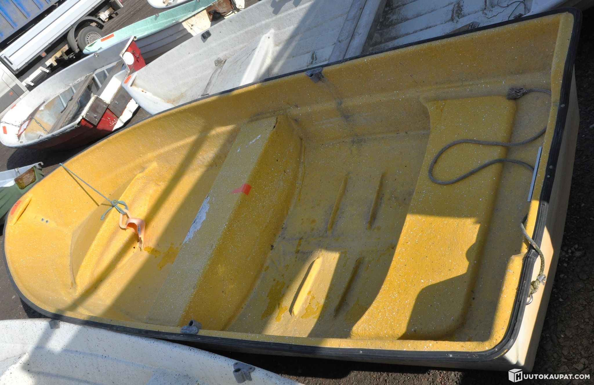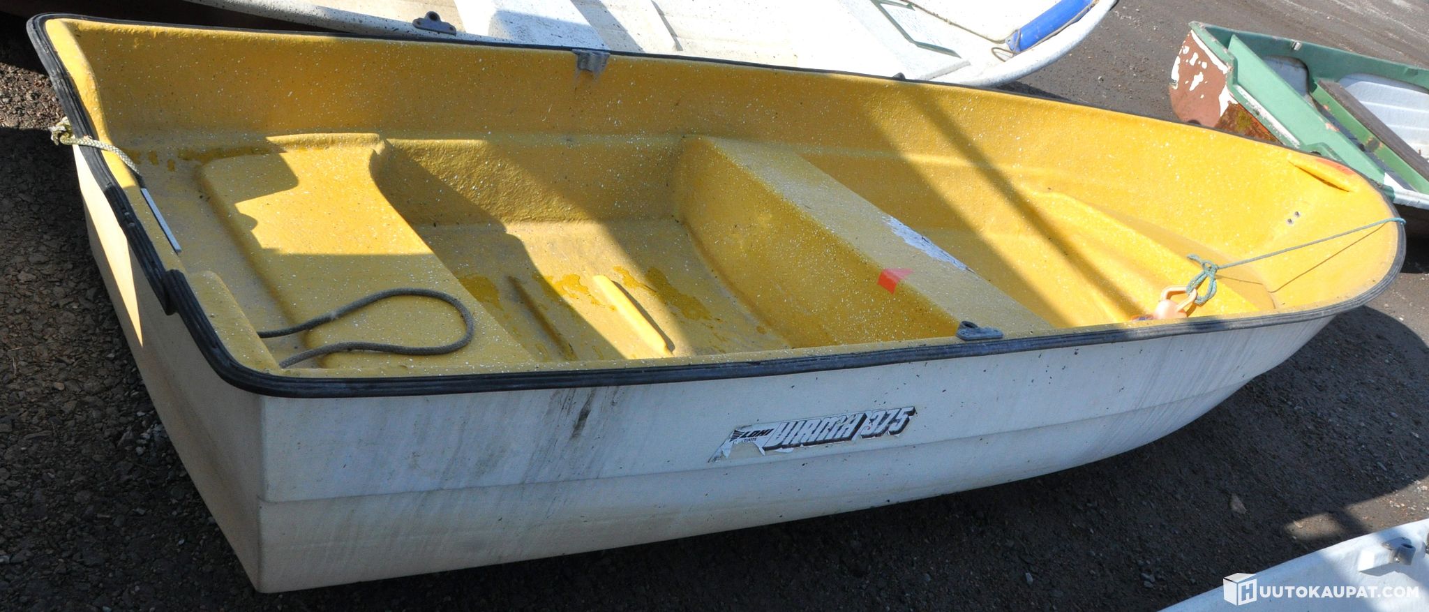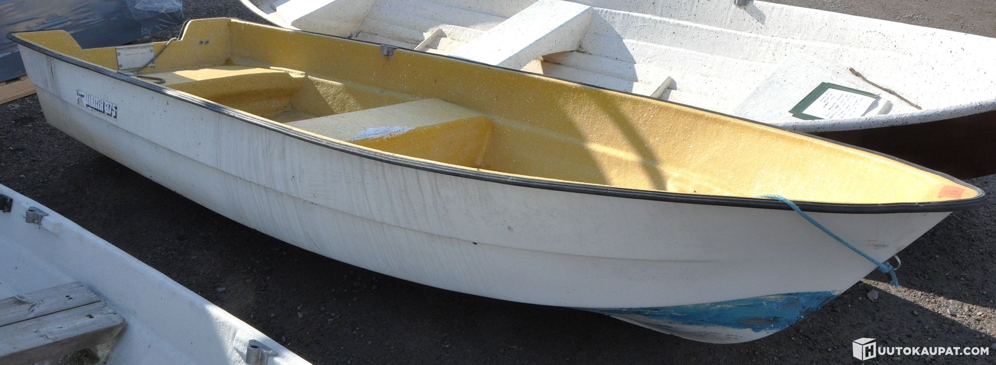 Boat: White / blue exterior, yellow interior, make: Lohi Virma