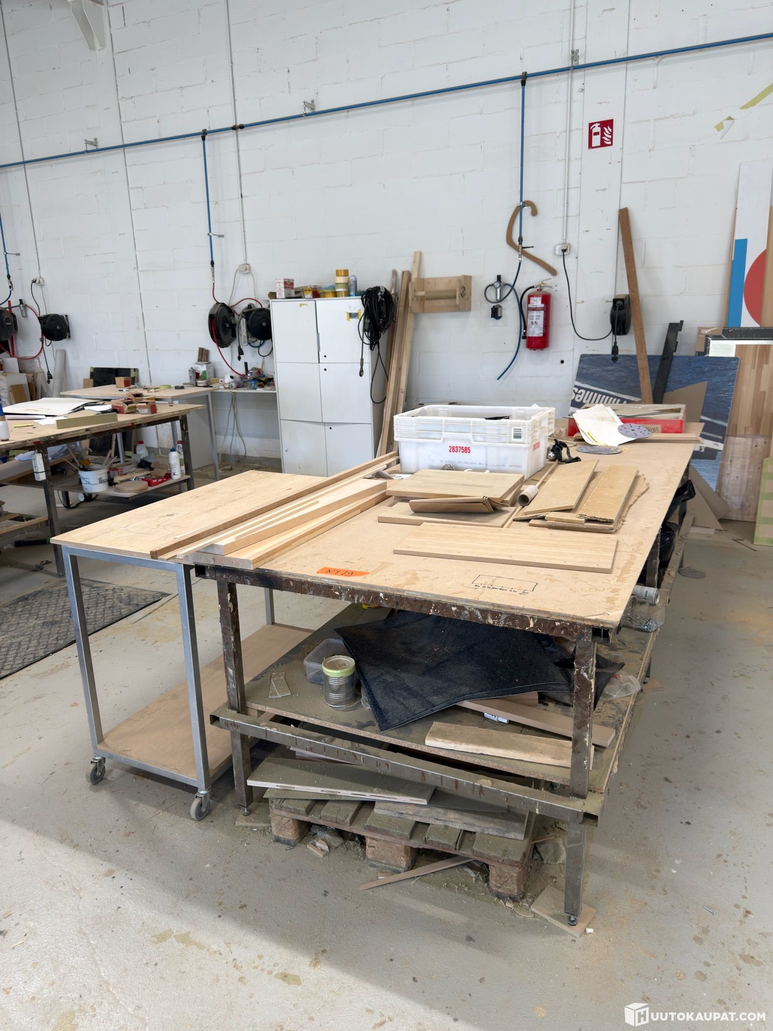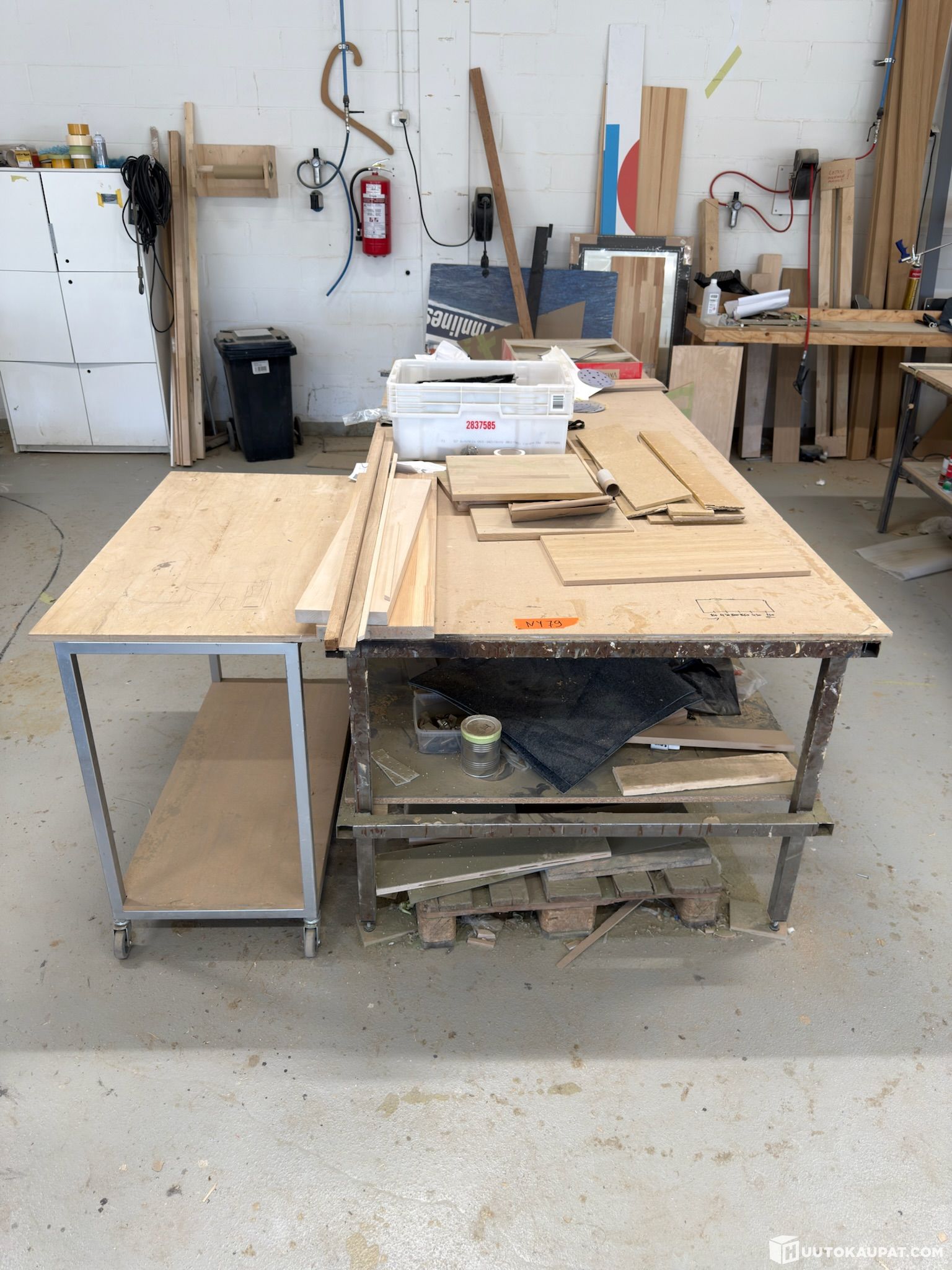 Workbench/workshop table 3000×1500 mm with contents, shelving trolley.