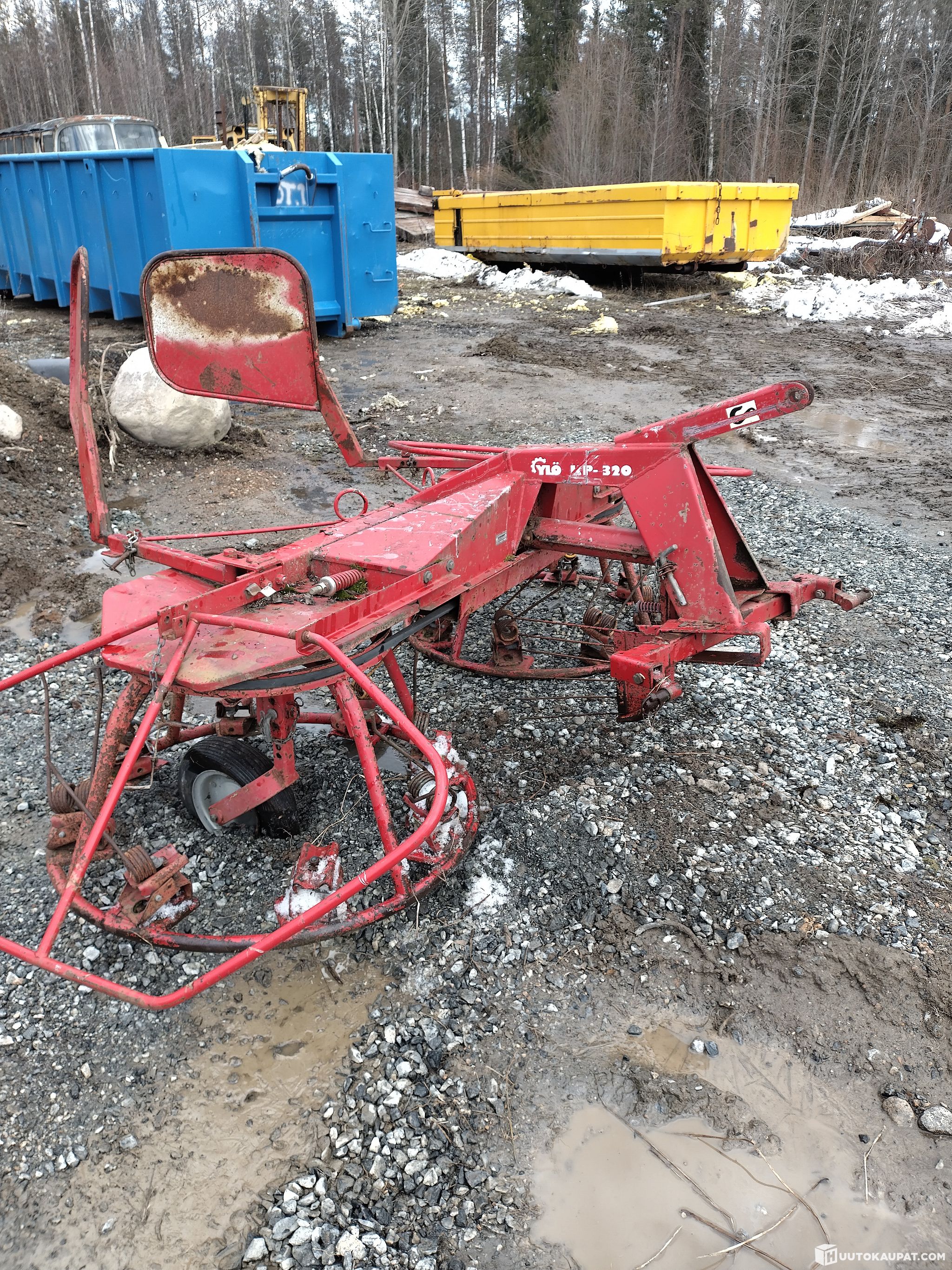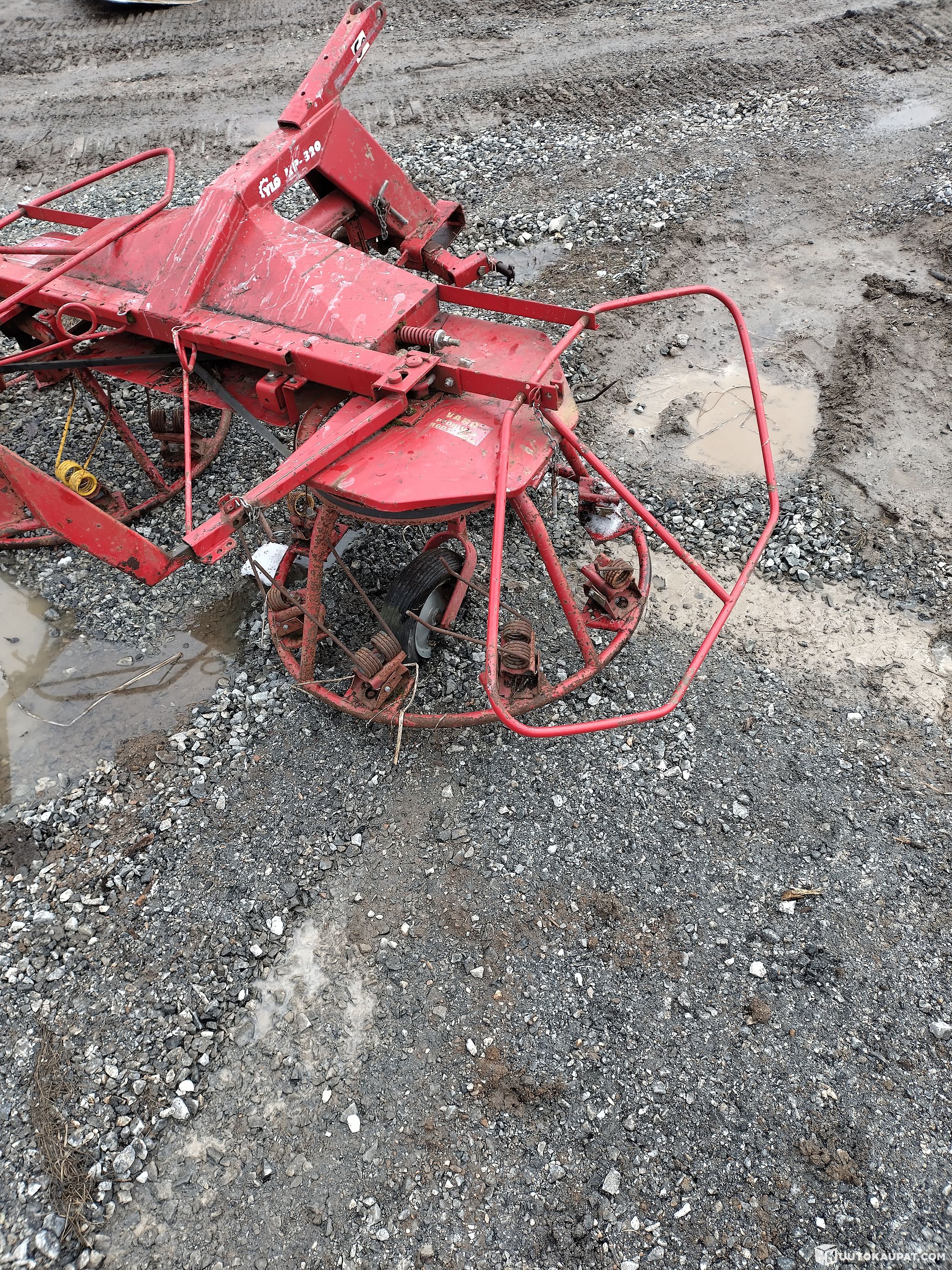 For sale: a tedder, lightly used and ready for use. Parts missing: the support wheel on one side and about 3 springs broken from a disc. Belts, drives and the like are in good condition and the machine has good paintwork and is straight.