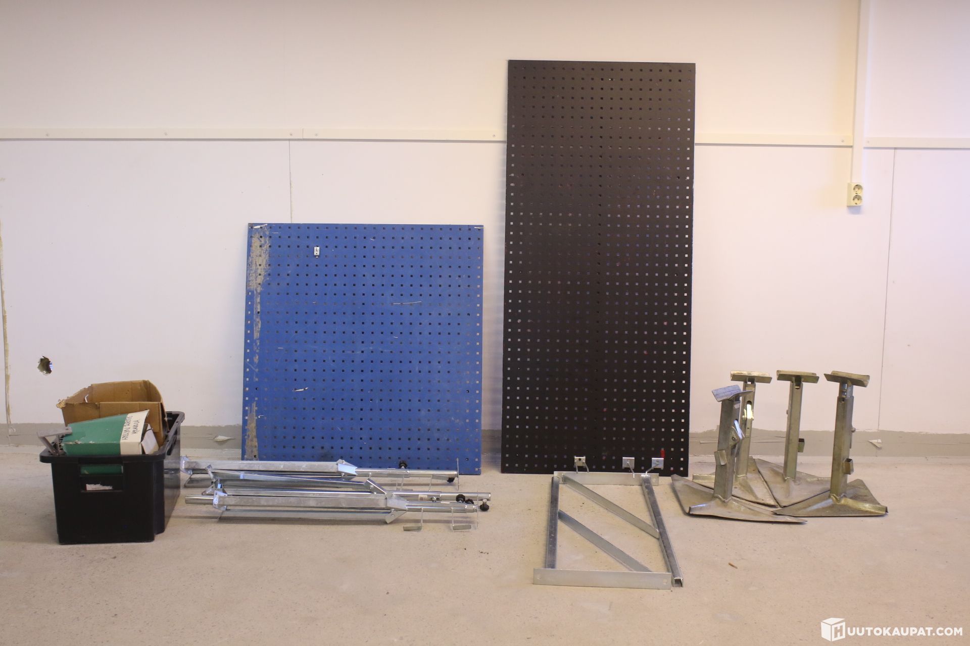 Four heavy cable reel stands, two metal perforated plates and a large number of fixings for them.