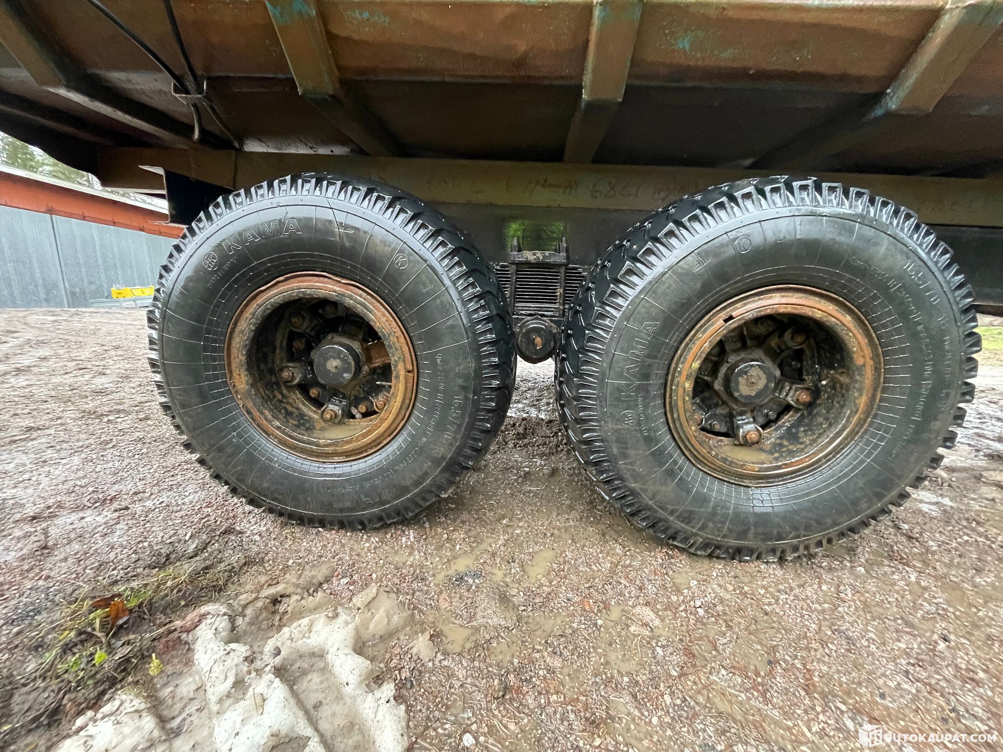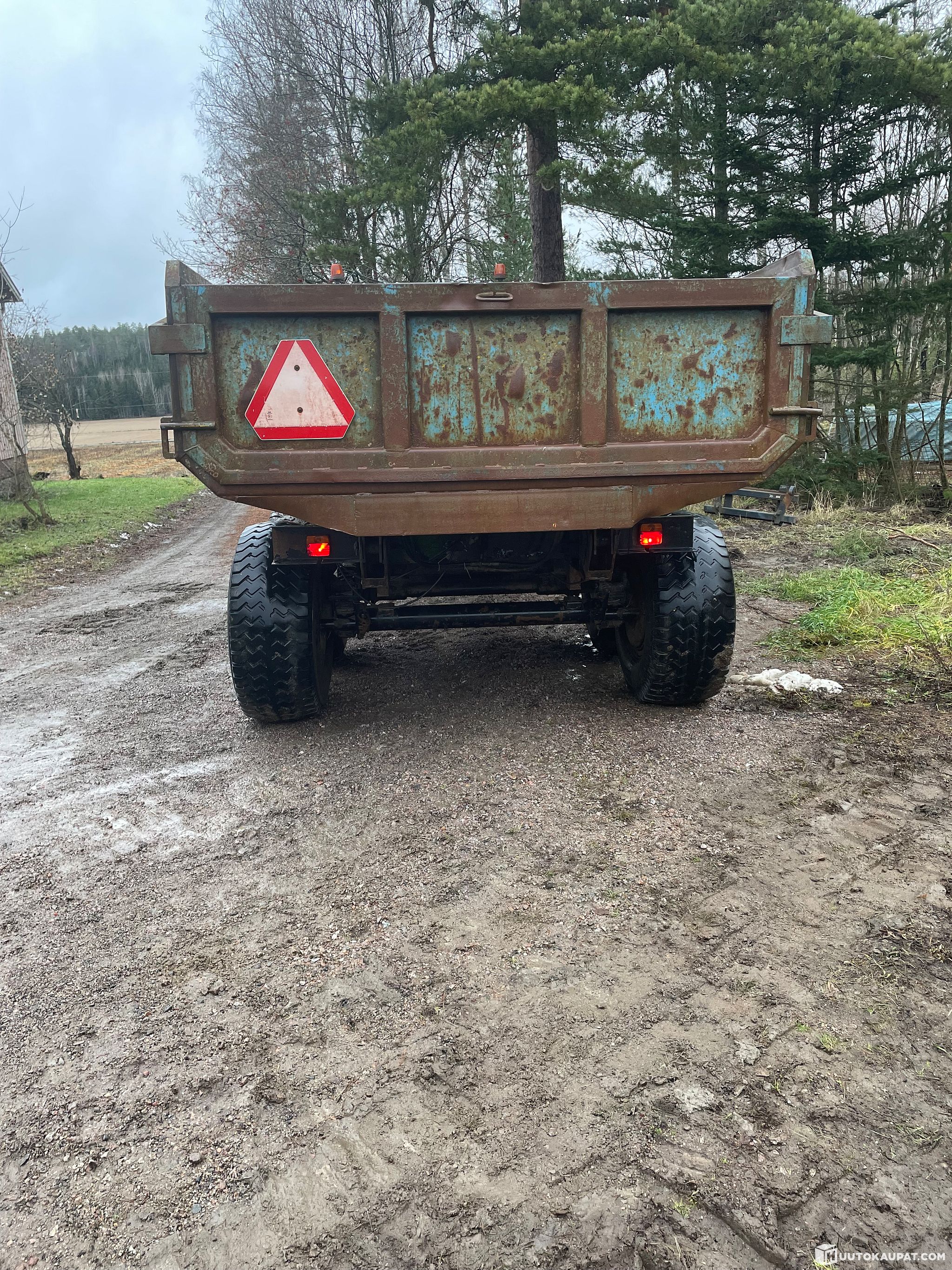 For sale: an earthmoving trailer, heavily used after being replaced by a larger new one. Functional, but one wheel rim is bent and has always wobbled — it has not, however, affected driving. Leaf springs, easy to tow. Brakes on one axle. Load capacity 12 tonnes. Bed floor and sides are dented but intact. Lights work.