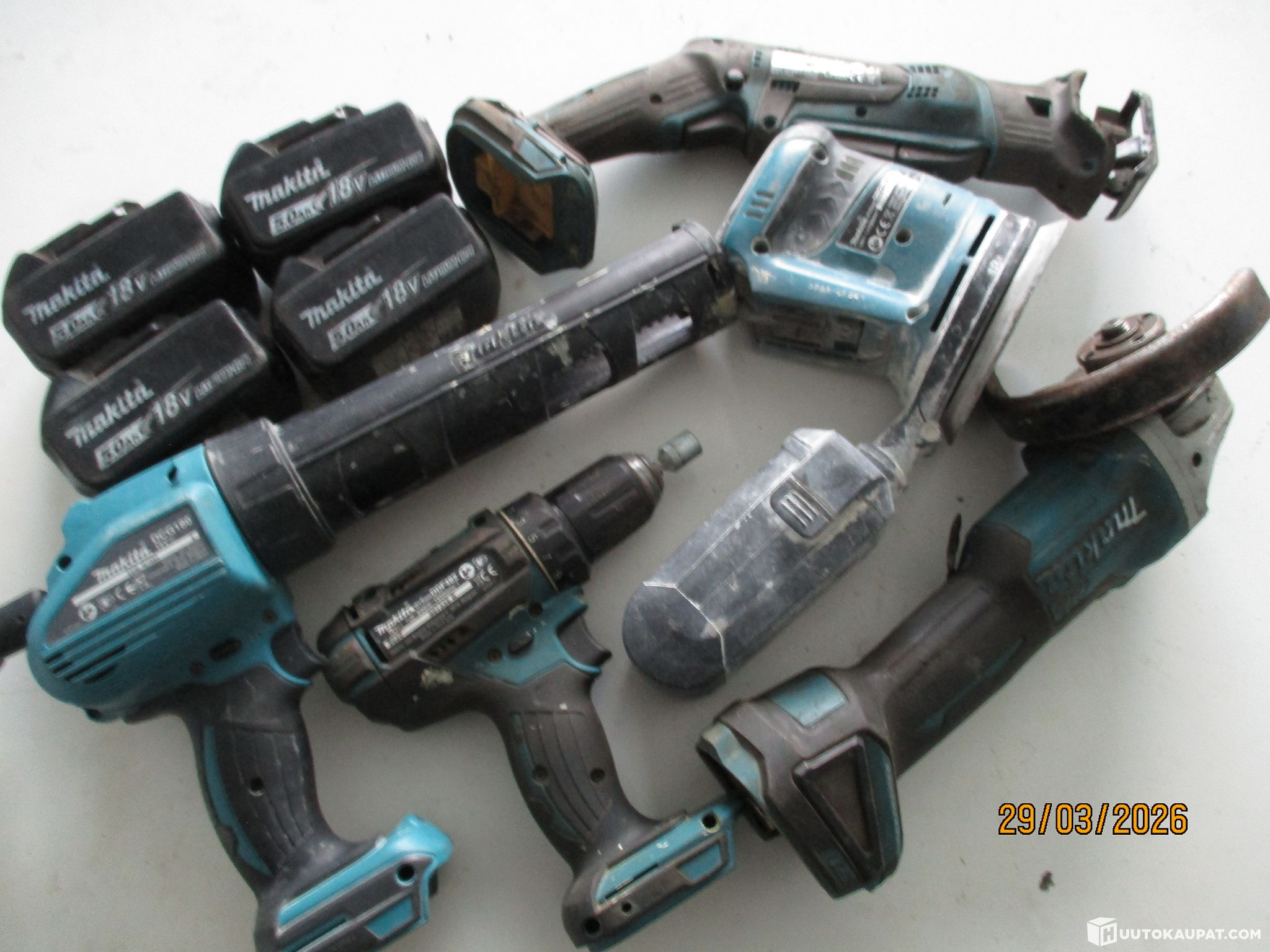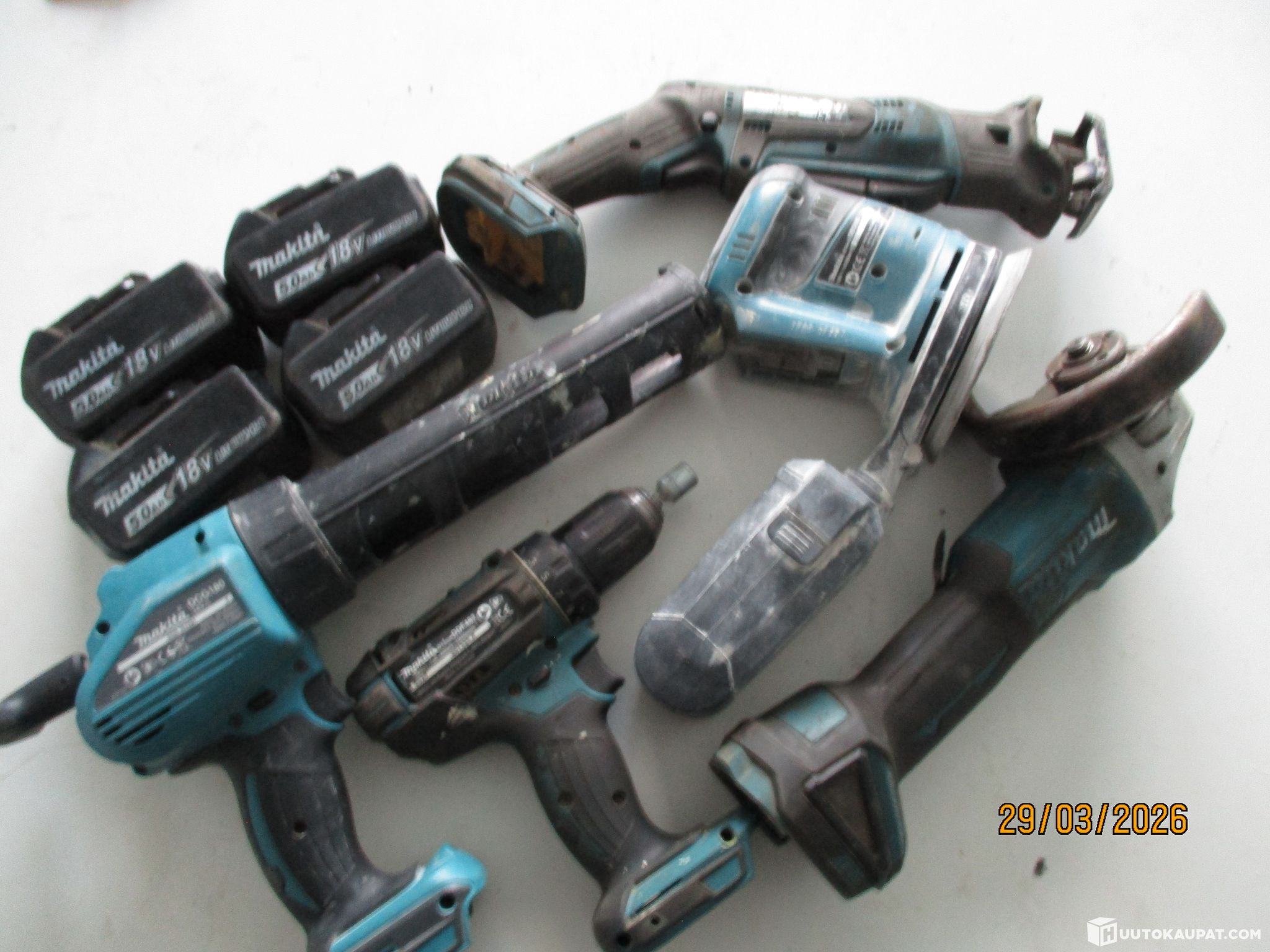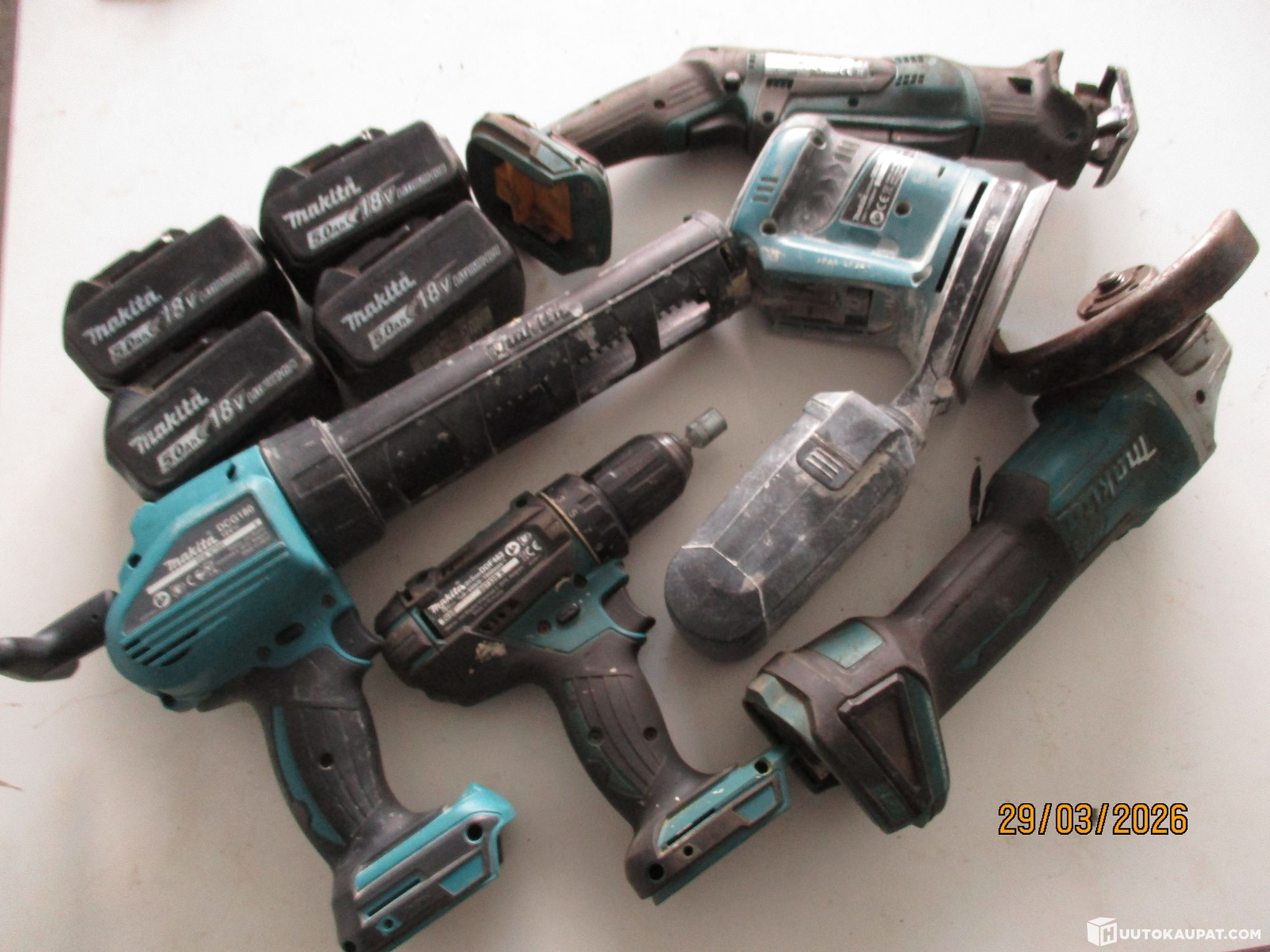 Makita 18V cordless tools, 5 pcs; charged batteries 4× 5 Ah; silicone clamp; cordless drill (chuck stuck); random orbital sander with dust extraction; angle grinder with 125 mm disc; reciprocating saw. Machines are working, batteries charged, sold as surplus.