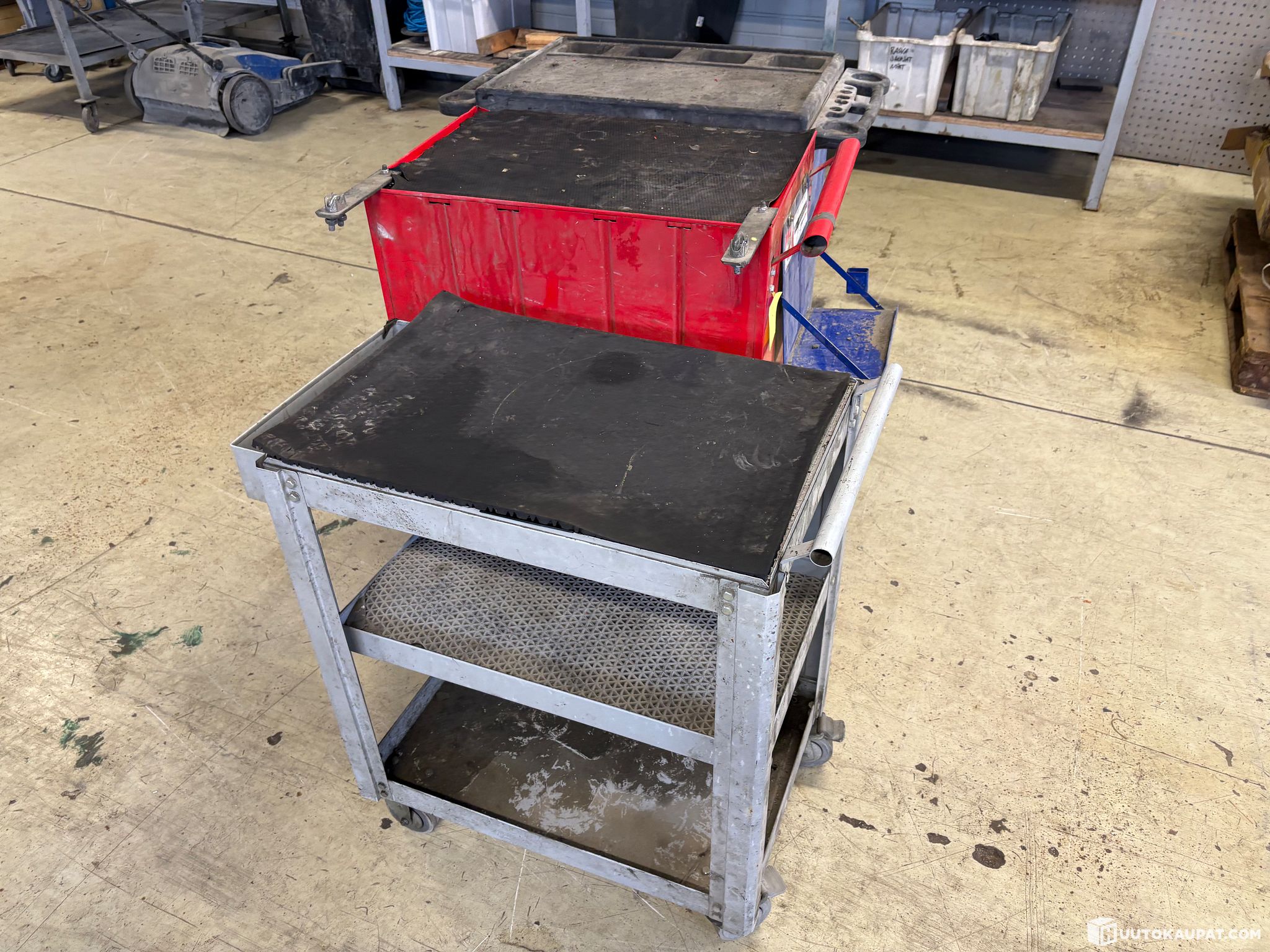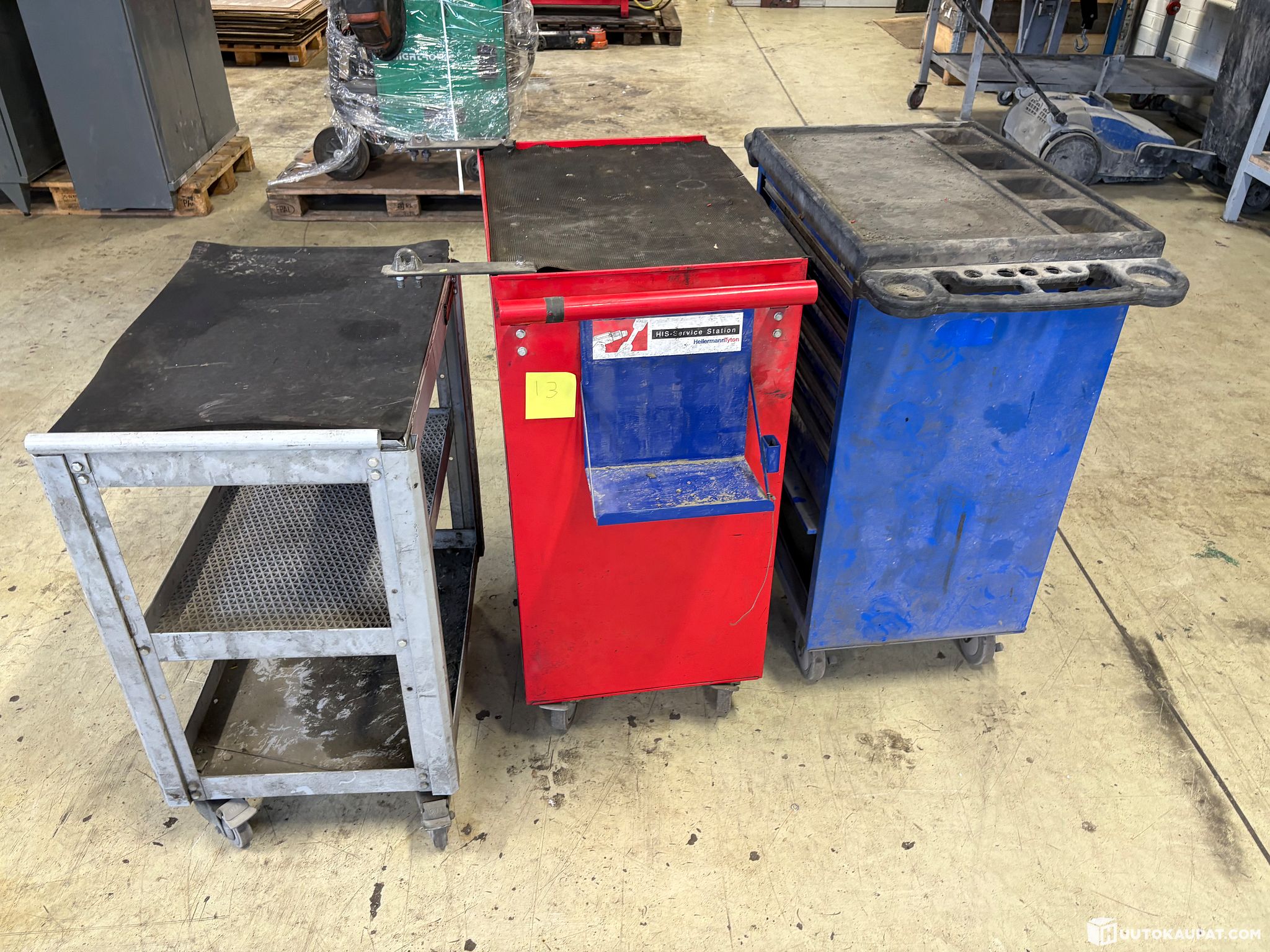 13. Empty, used but functioning tool trolleys, 2 units, and a worktop.