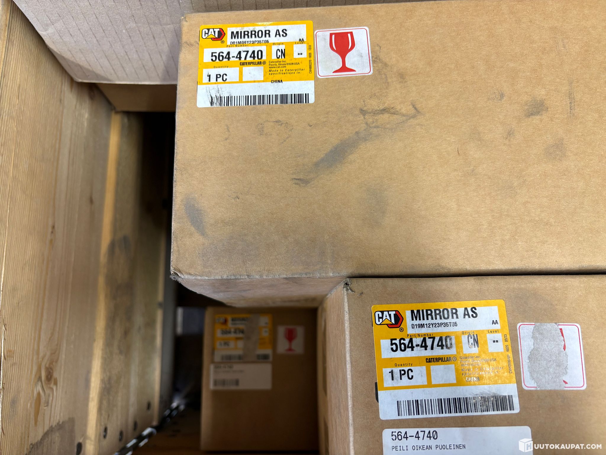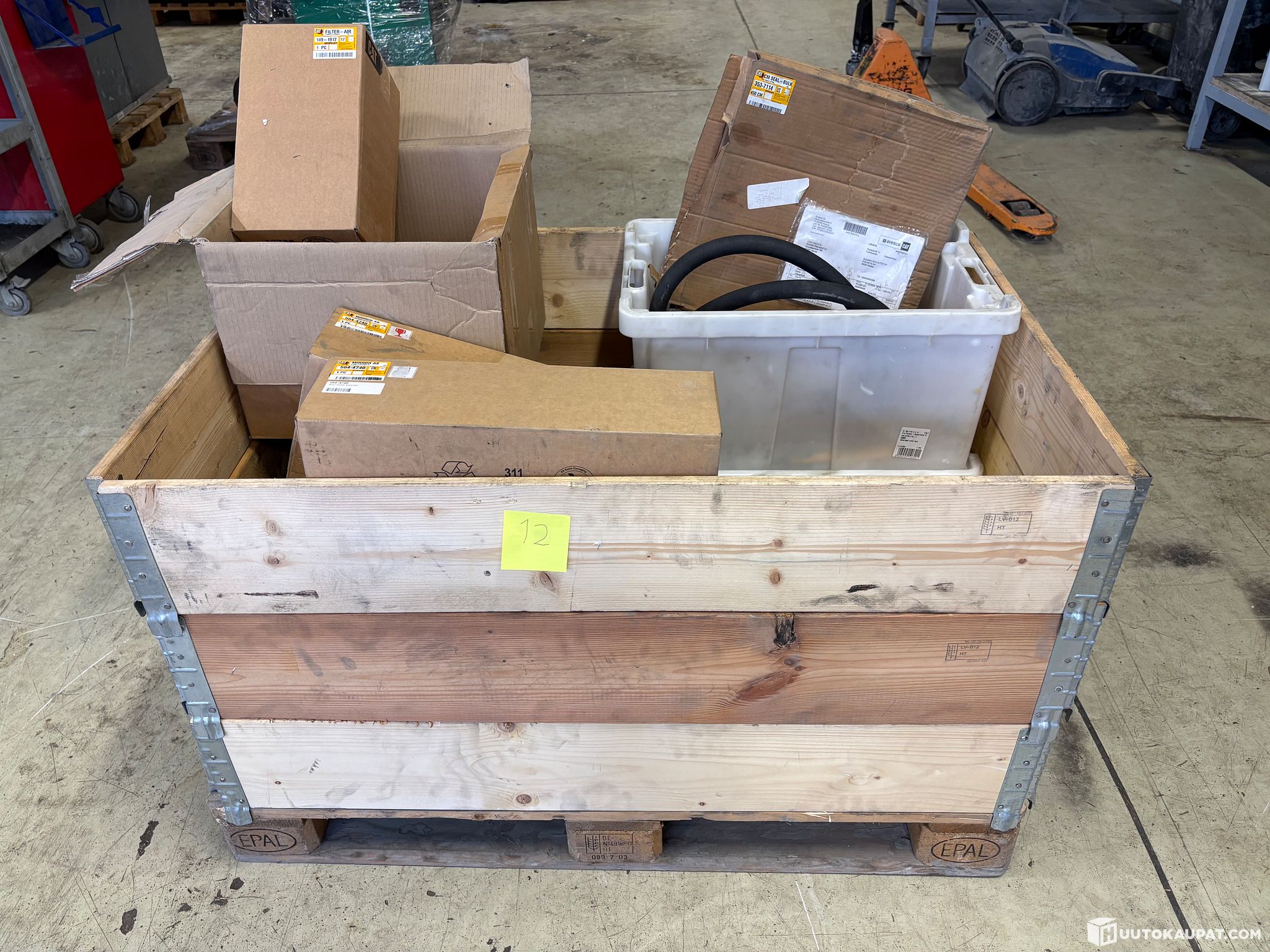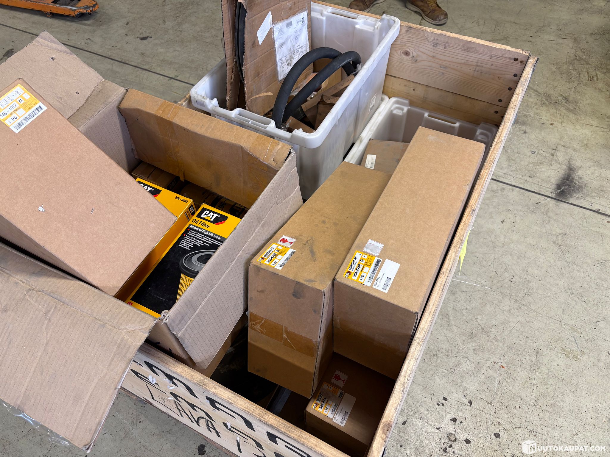 12. Caterpillar maintenance parts. Filters, hose, mirrors, fan motor, etc. Original and aftermarket parts.