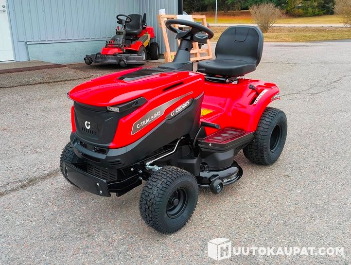 Powerful and brand-new Cedrus ride-on mower. Compact and sturdy construction, 86 cm cutting width, electric start and a side-discharge cutting deck make the machine easy to use. LED lights, hour meter, wash connector and supplied tow ball add practicality. Mulching plugs for the deck are included if you want to use the machine for mulching. Oil and petrol were added at Kone Korpela's workshop and the machine is fully ready for use.