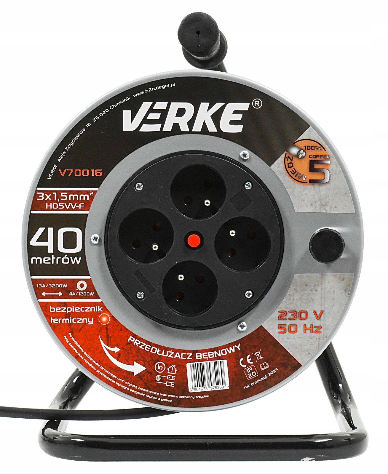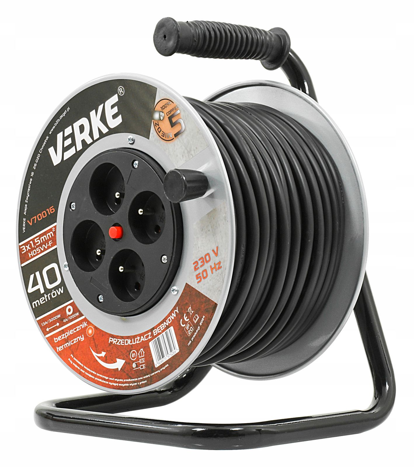 High-quality 40-metre extension reel with four sockets. The cable is made of three copper conductors with a cross-section of 1.5 mm². This cross-section allows four devices to be connected simultaneously, which is especially useful on construction sites or in workshops. The conductors are covered with PVC insulation, which is highly resistant to mechanical damage, weather and chemicals. The extension lead is fitted with a thermal fuse.