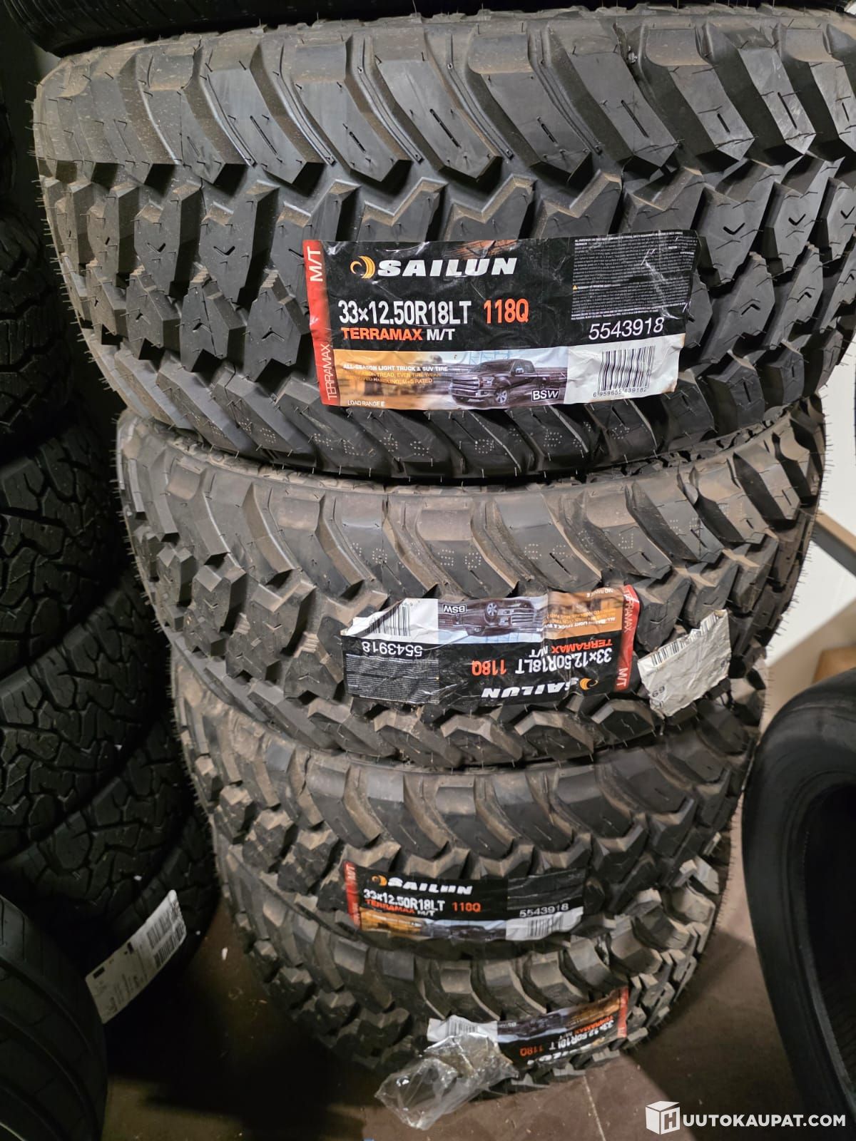 New, unused Sailun Terramax M/T off-road tyres. Size: 33x12.50R18LT (≈838 mm diameter × 318 mm width, 18-inch rim). Load and speed rating: 118Q. Model: Terramax M/T (Mud Terrain). Quantity: 4 pcs.