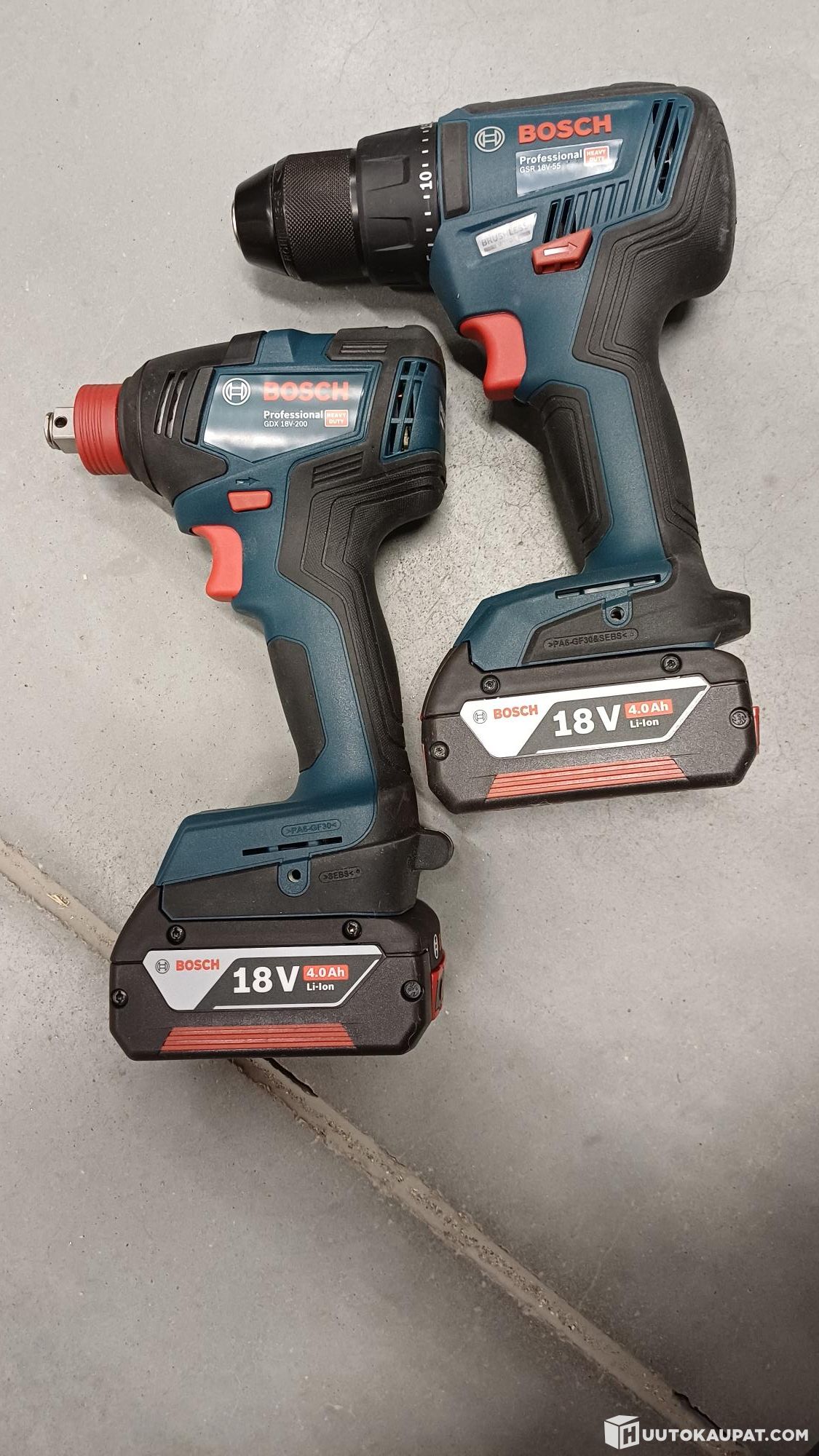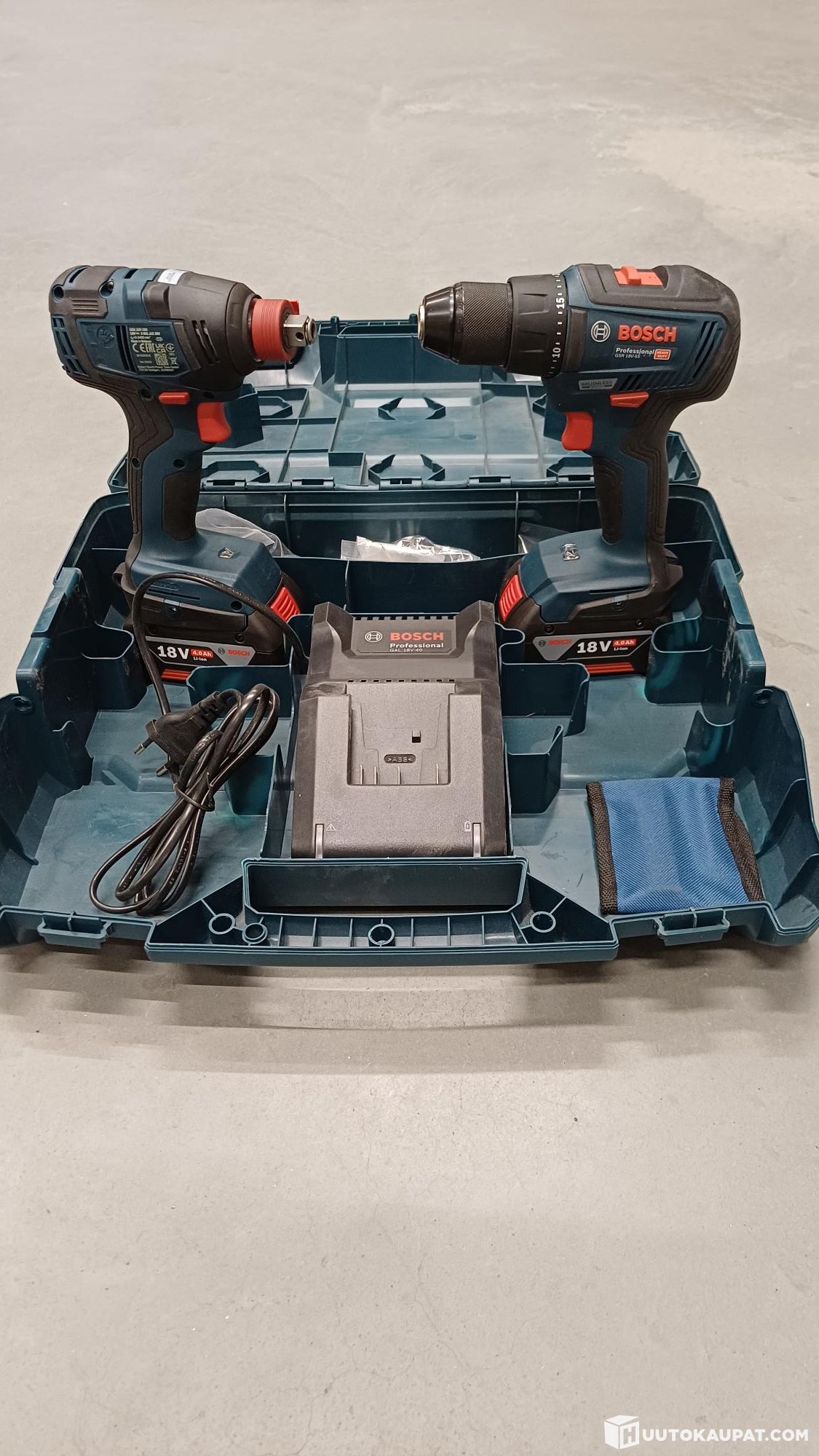 Powerful professional-series kit. Impact driver, cordless drill, 2×4 Ah batteries, charger and bag.