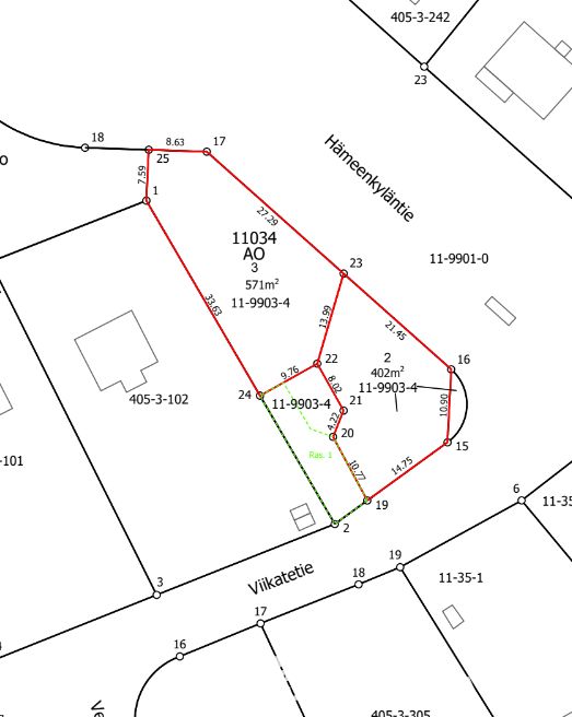 The property 92-11-34-3 is located in the Hämevaara district. In the local detailed plan the area is designated as a detached-house block (AO). One dwelling may be built on the plot. The maximum permitted number of storeys is two (II).