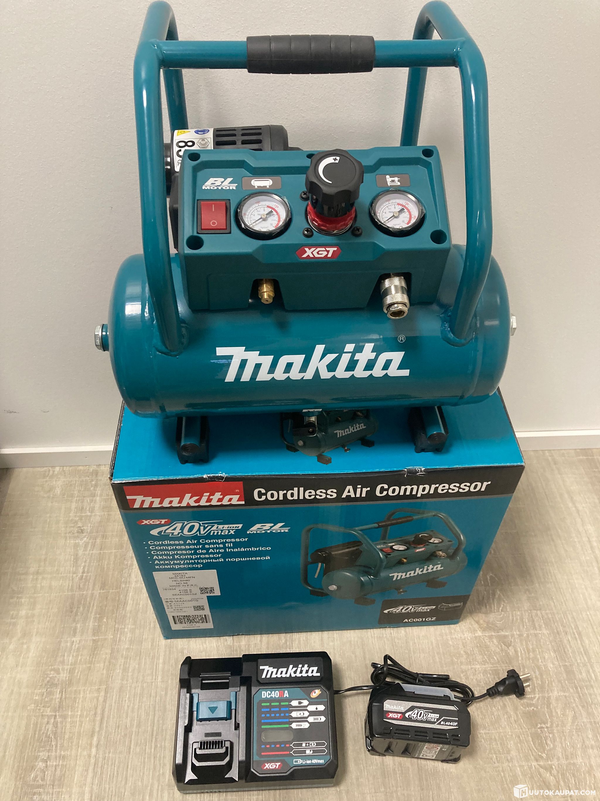 New Makita compressor 40V AC001GZ, supplied with a 4 Ah battery and charger.