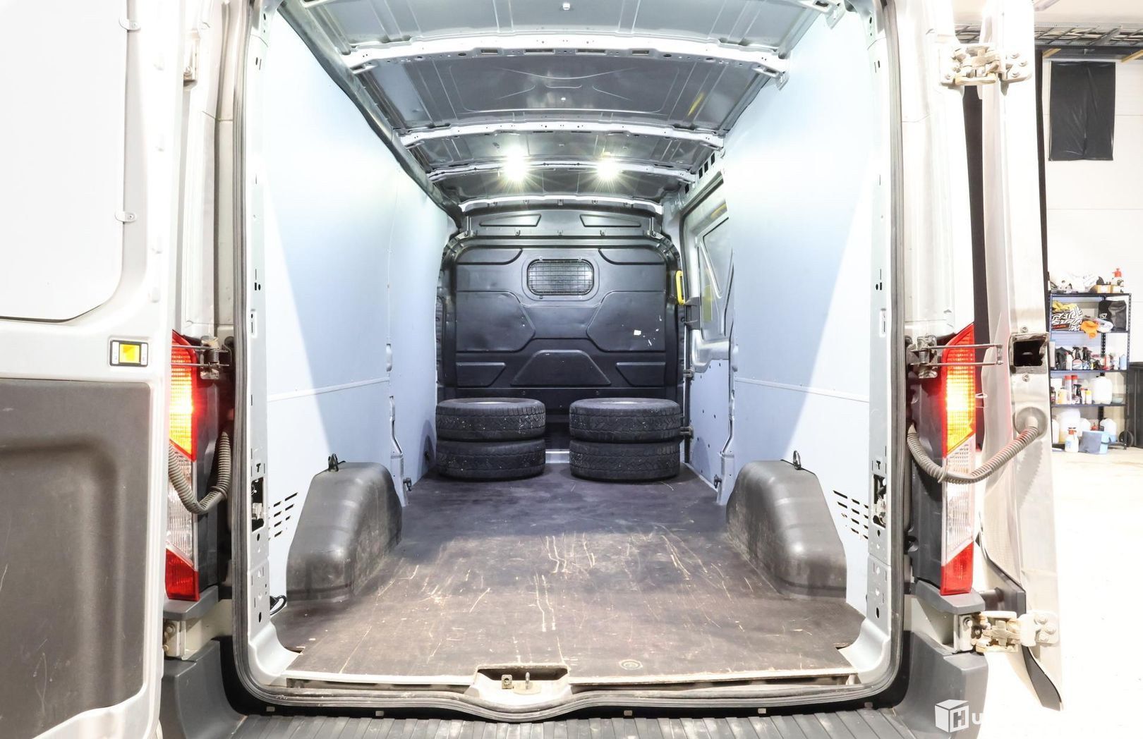 The load area is lined with plywood from walls to ceiling, and the floor has a rubber mat with attachment points. The sides offer generous shelving and drawers, and there is a dedicated heater in the cargo area.