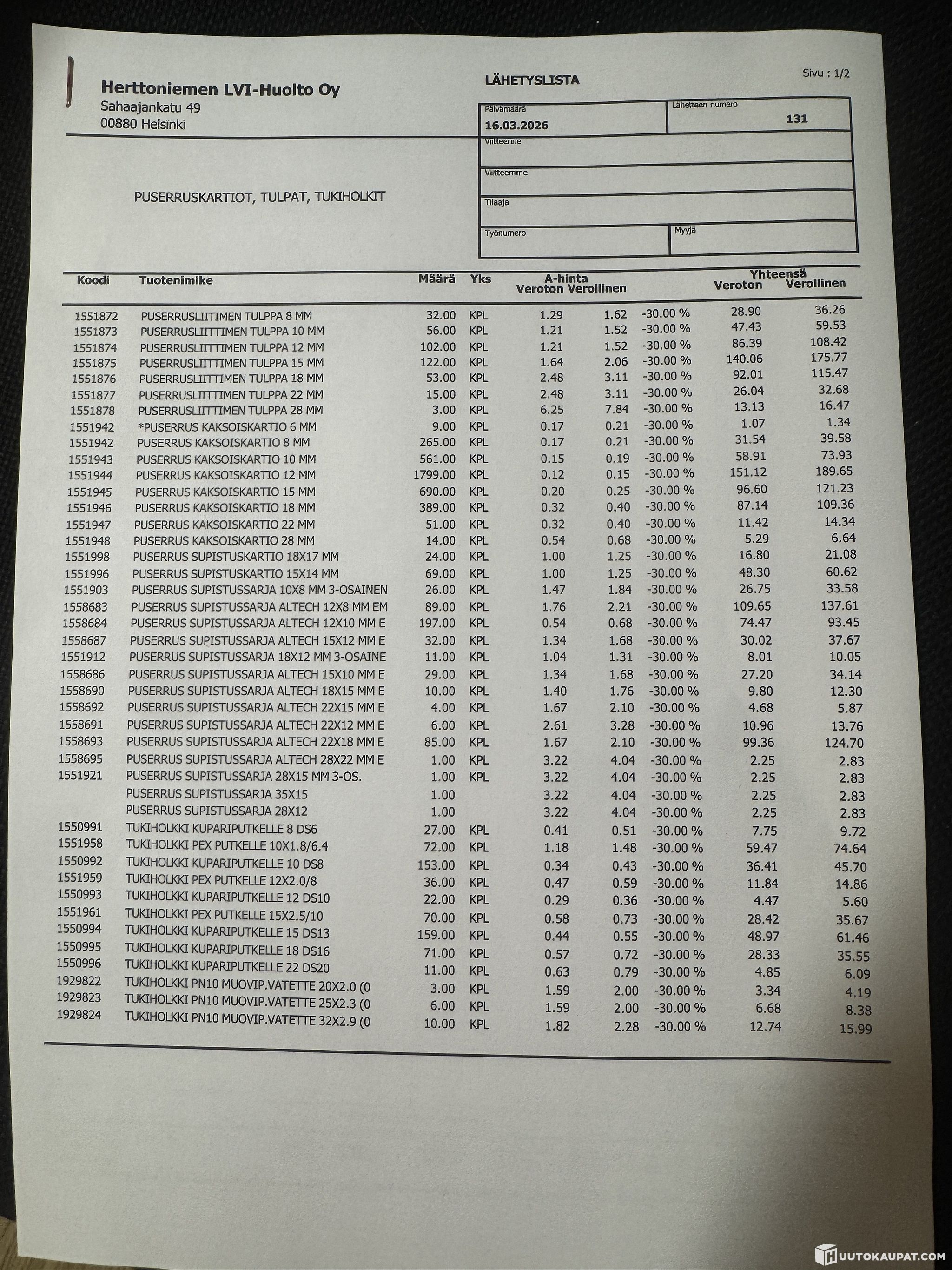 Puserrusliittimiä (erä 2074) Herttoniemen LVI-Huolto Oy konkurssipesä 0946209-2, Espoo