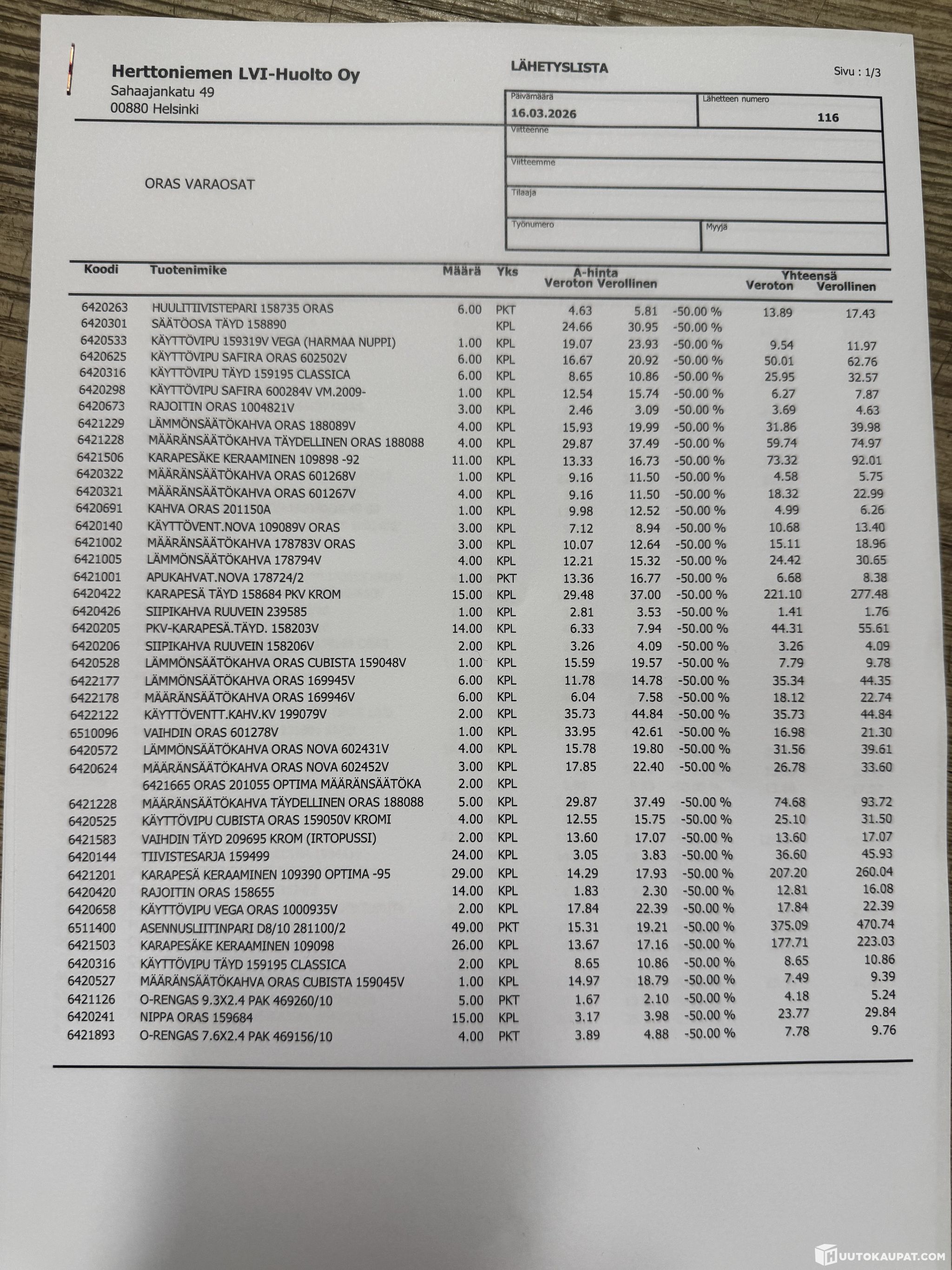 Oras spare parts (lot 2063) Herttoniemen LVI-Huolto Oy bankruptcy estate 0946209-2, Espoo