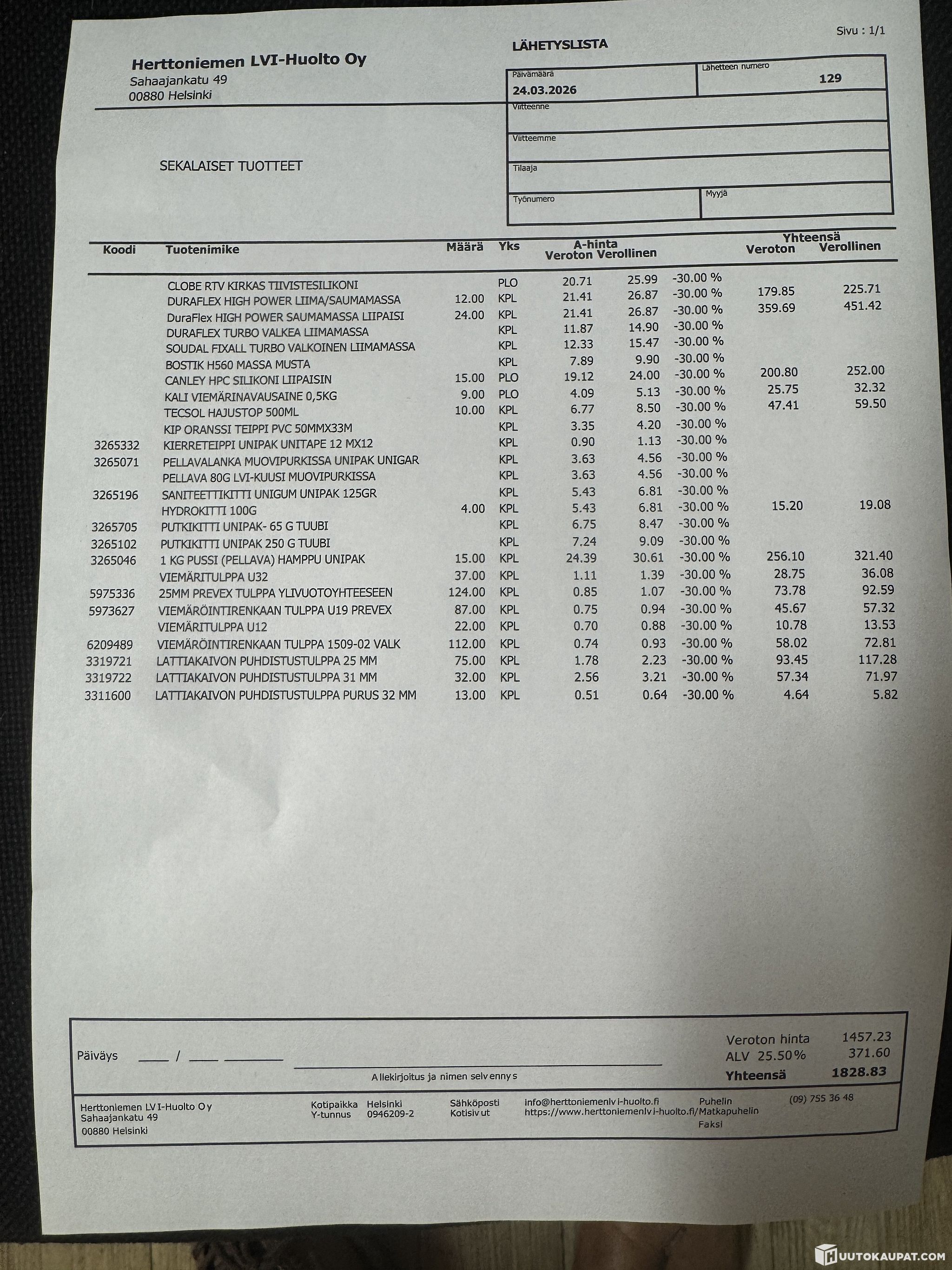 Pipe sealants, compounds, accessories (lot 2077) Herttoniemen LVI-Huolto Oy bankruptcy estate 0946209-2, Espoo