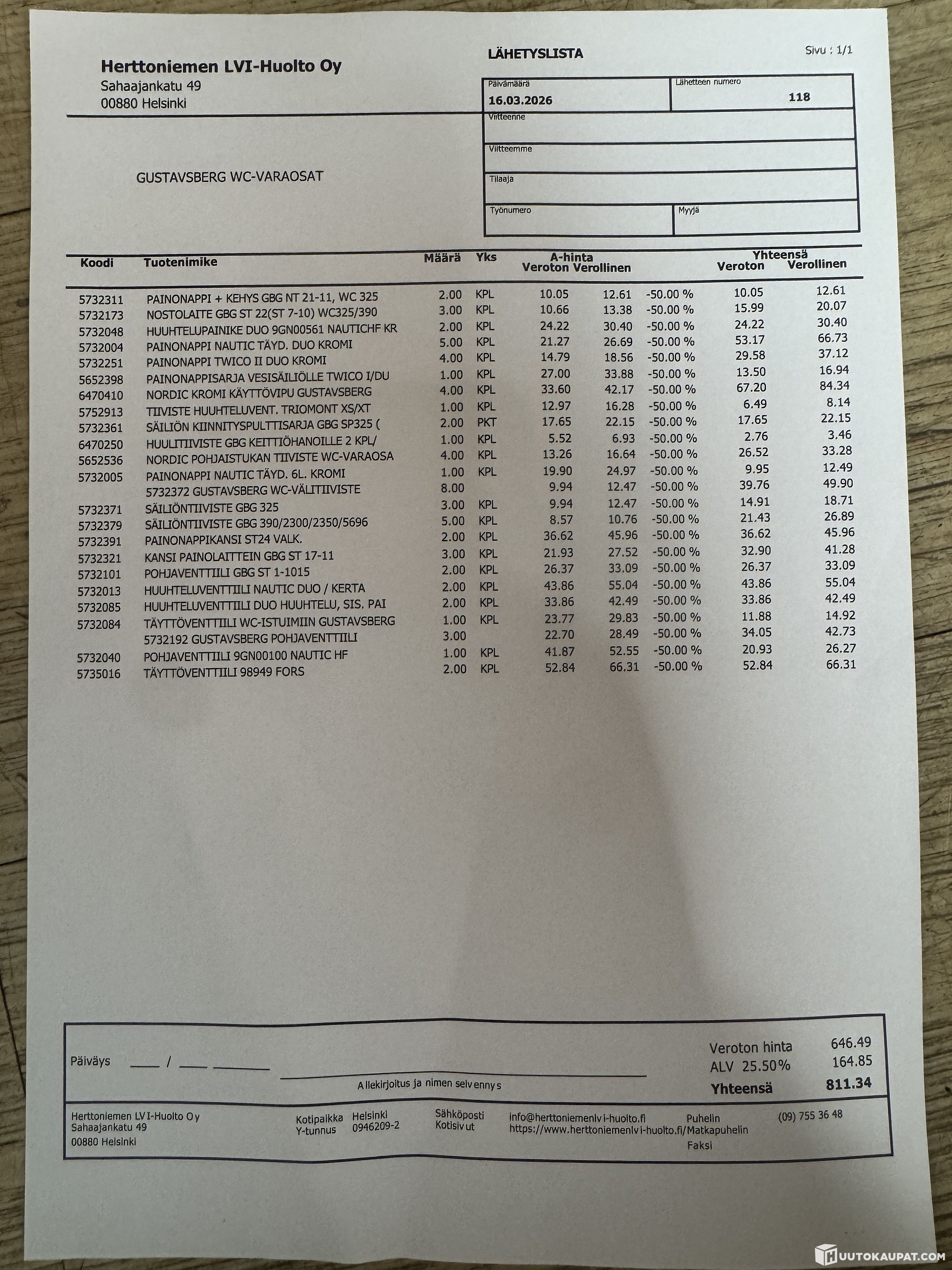 Gustavsberg WC spare parts (lot 2070) Herttoniemen LVI-Huolto Oy bankruptcy estate 0946209-2, Espoo