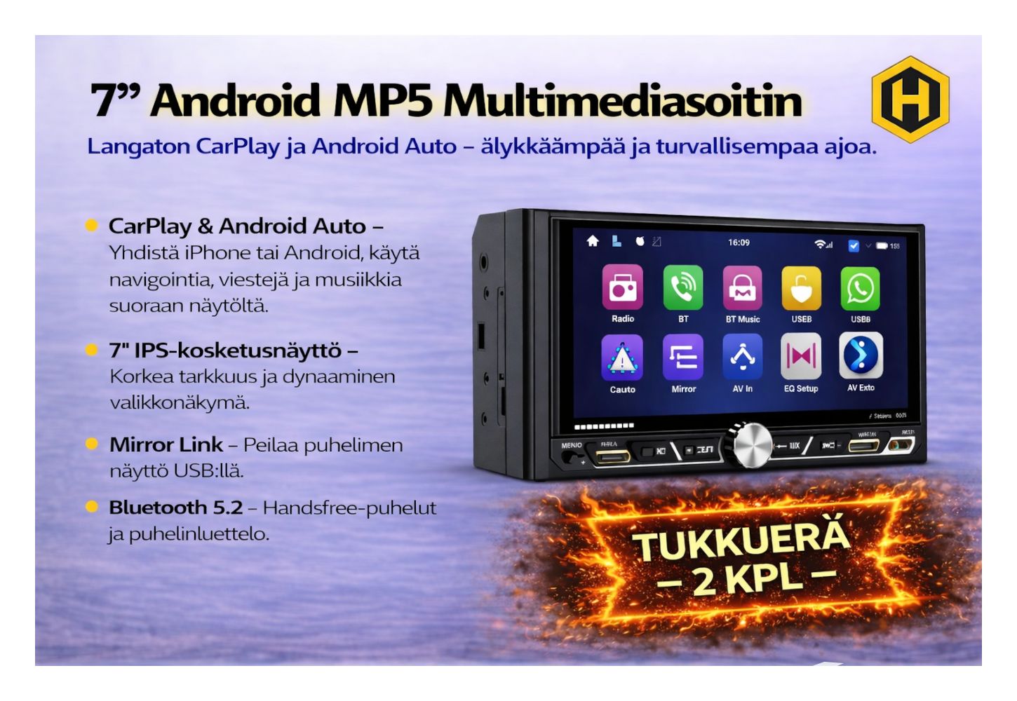 Keywords: Android MP5 player, 7" display, CarPlay, Android Auto, Bluetooth 5.2, IPS, FM/AM/RDS, TDA7388, car stereo, multimedia