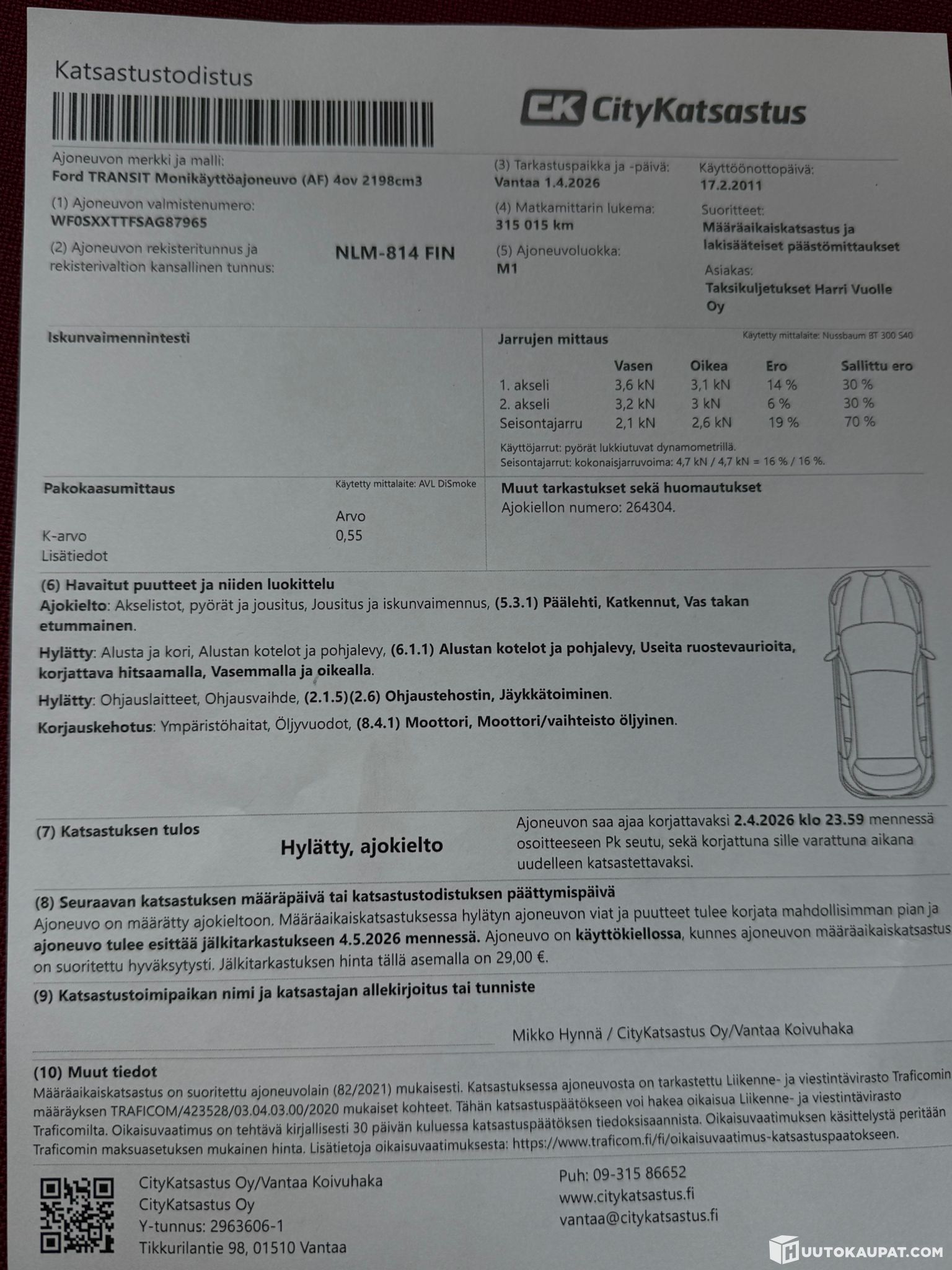 Failed inspection; see defect list in the picture.